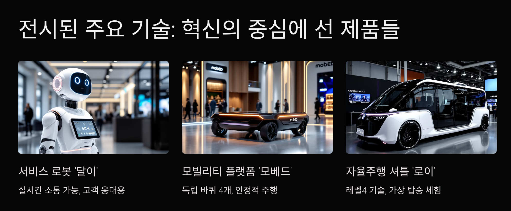 A: 서비스 로봇 ‘달이’, 다목적 플랫폼 ‘모베드’, 자율주행 셔틀 ‘로이’가 가장 큰 관심을 받았습니다.