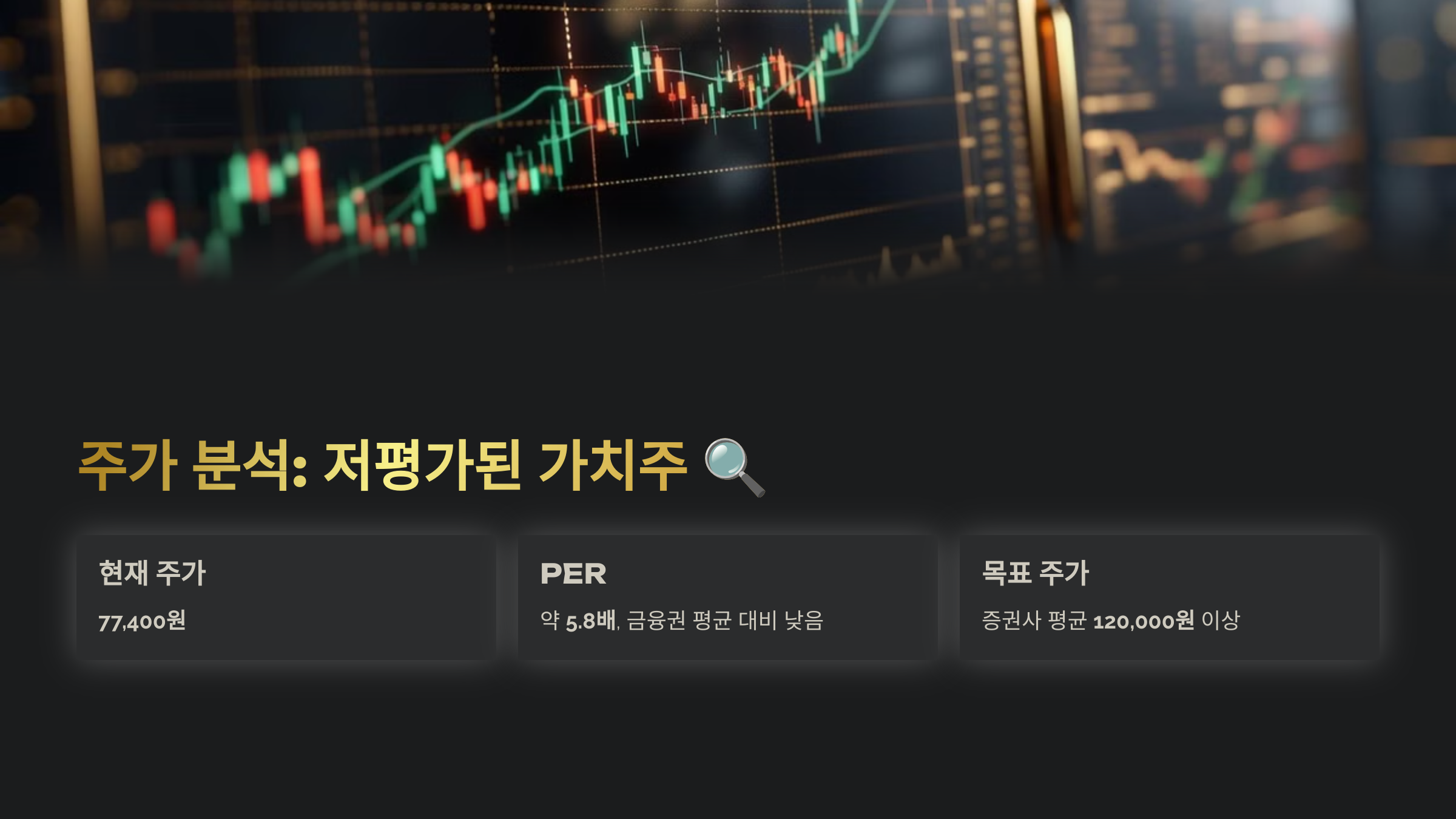 현재 KB금융의 주가는 약 77,400원이며, 증권사들은 이를 저평가된 가치주로 보고 있습니다.