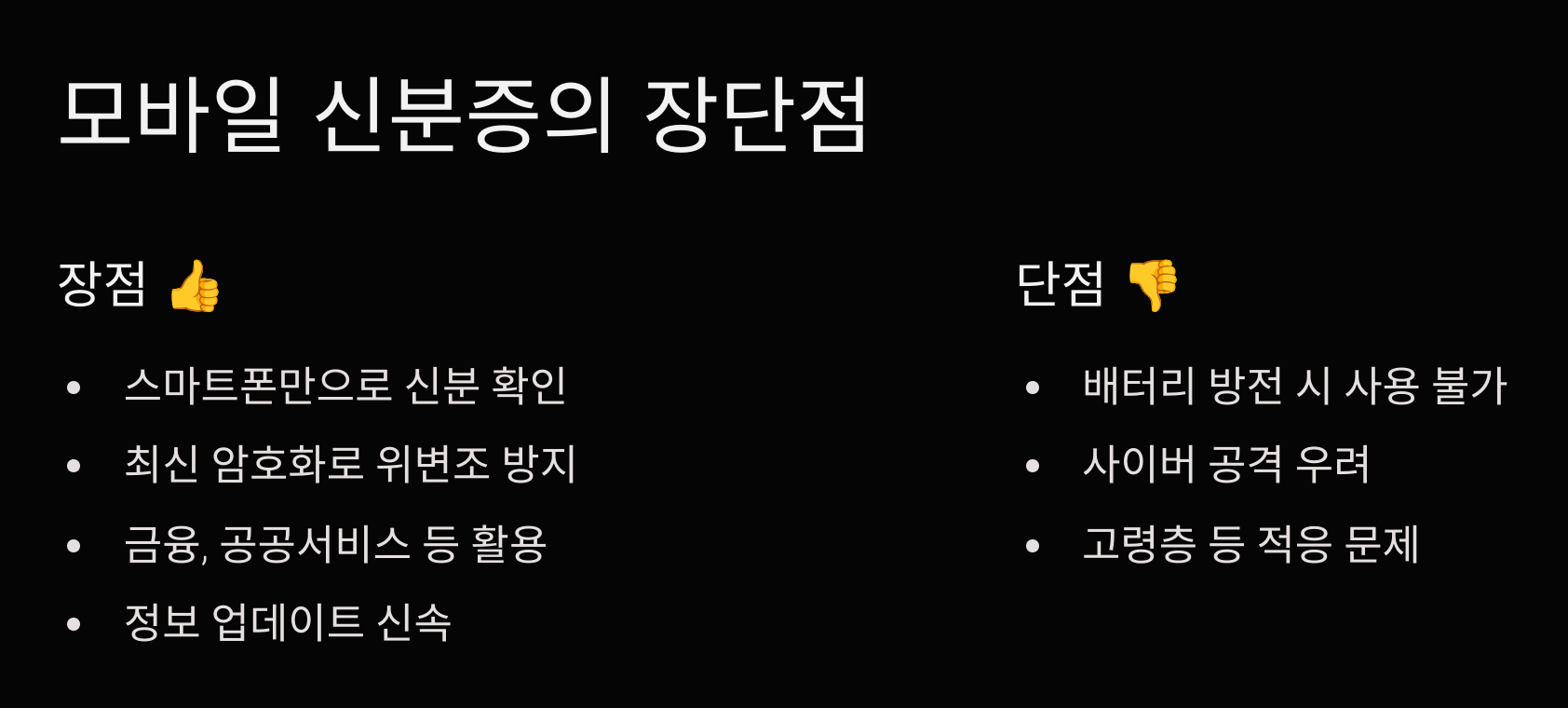 • 편의성: 지갑 없이 스마트폰만으로 신분 확인 가능