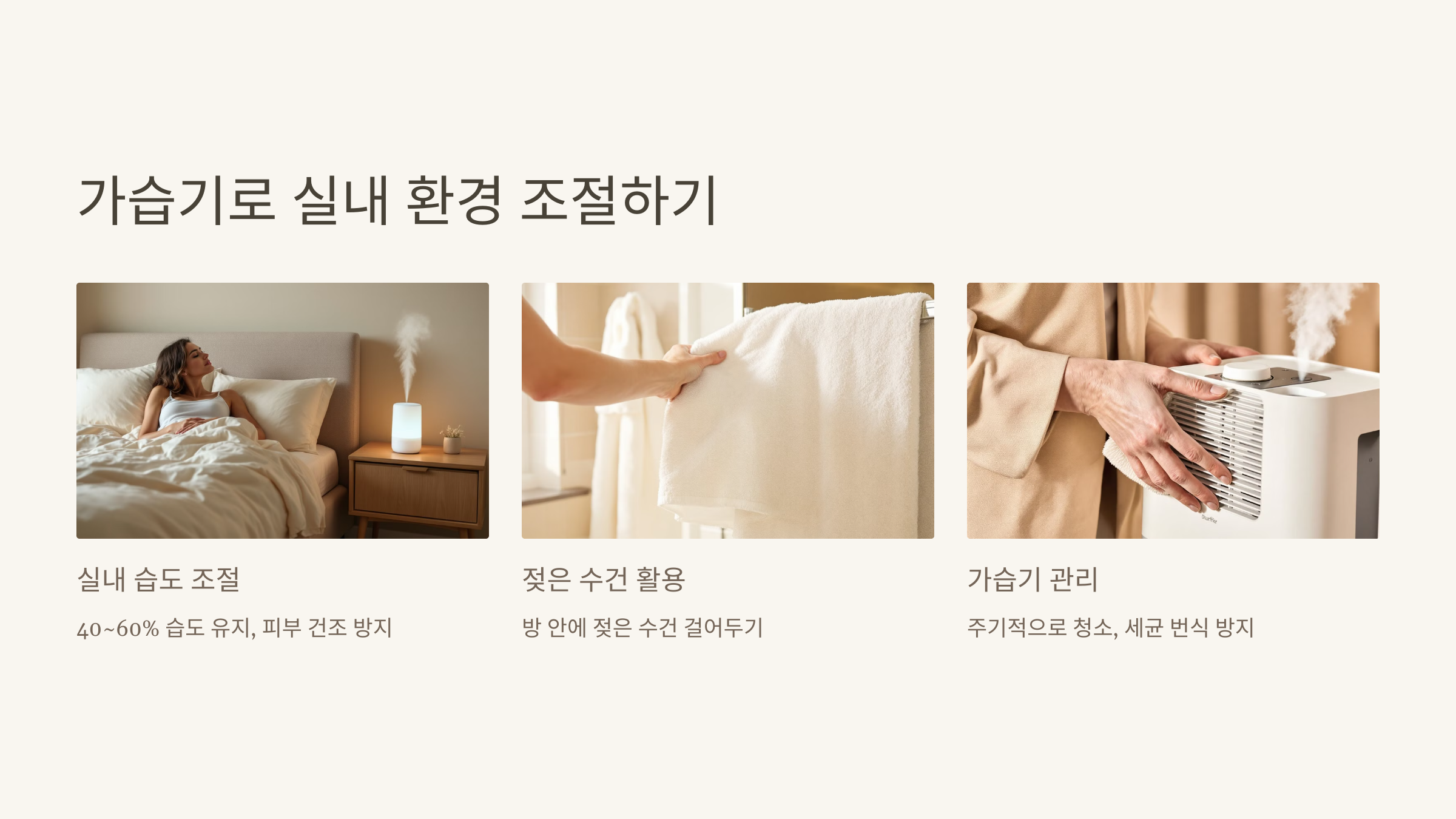 실내 습도를 40~60%로 유지하면 피부가 건조해지는 것을 방지할 수 있어요. 가습기를 사용하거나 젖은 수건을 방 안에 걸어두는 것도 좋은 방법입니다.