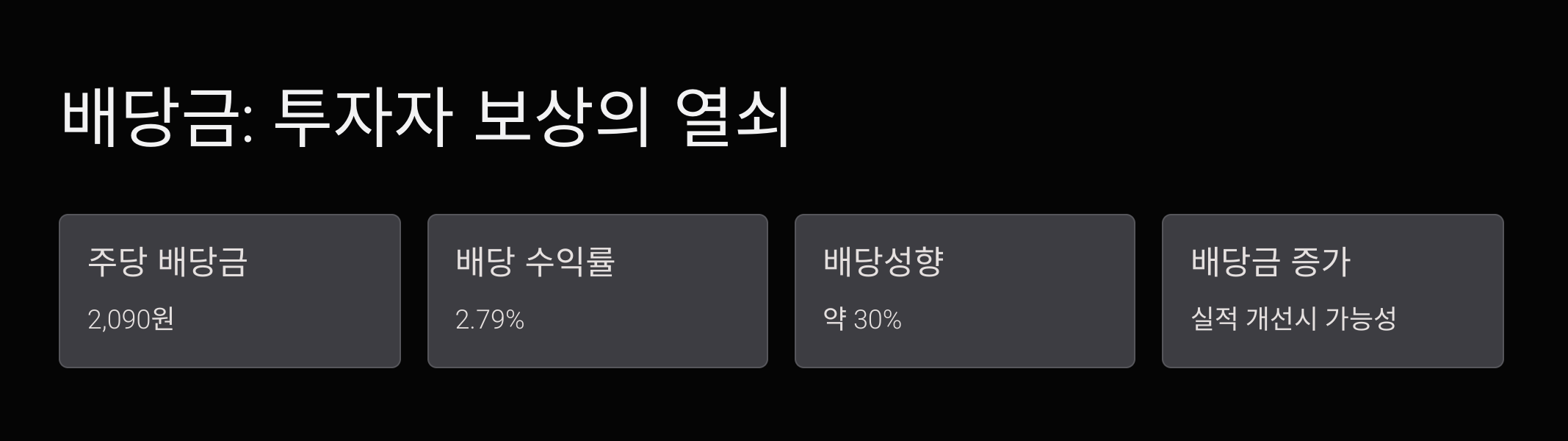비록 현재의 배당 수익률은 높지 않지만, 실적 개선에 따라 배당금 증가 가능성이 높아 장기 투자자들에게 매력적인 요소가 될 수 있습니다.