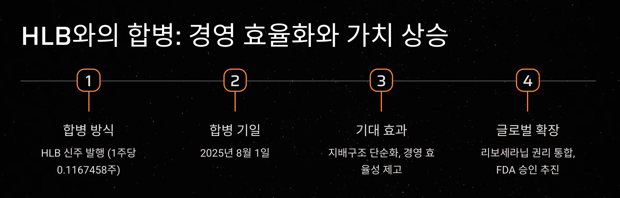 • 합병 방식: HLB생명과학 주주들에게 HLB 신주 발행 (1주당 HLB 주식 0.1167458주 배정)