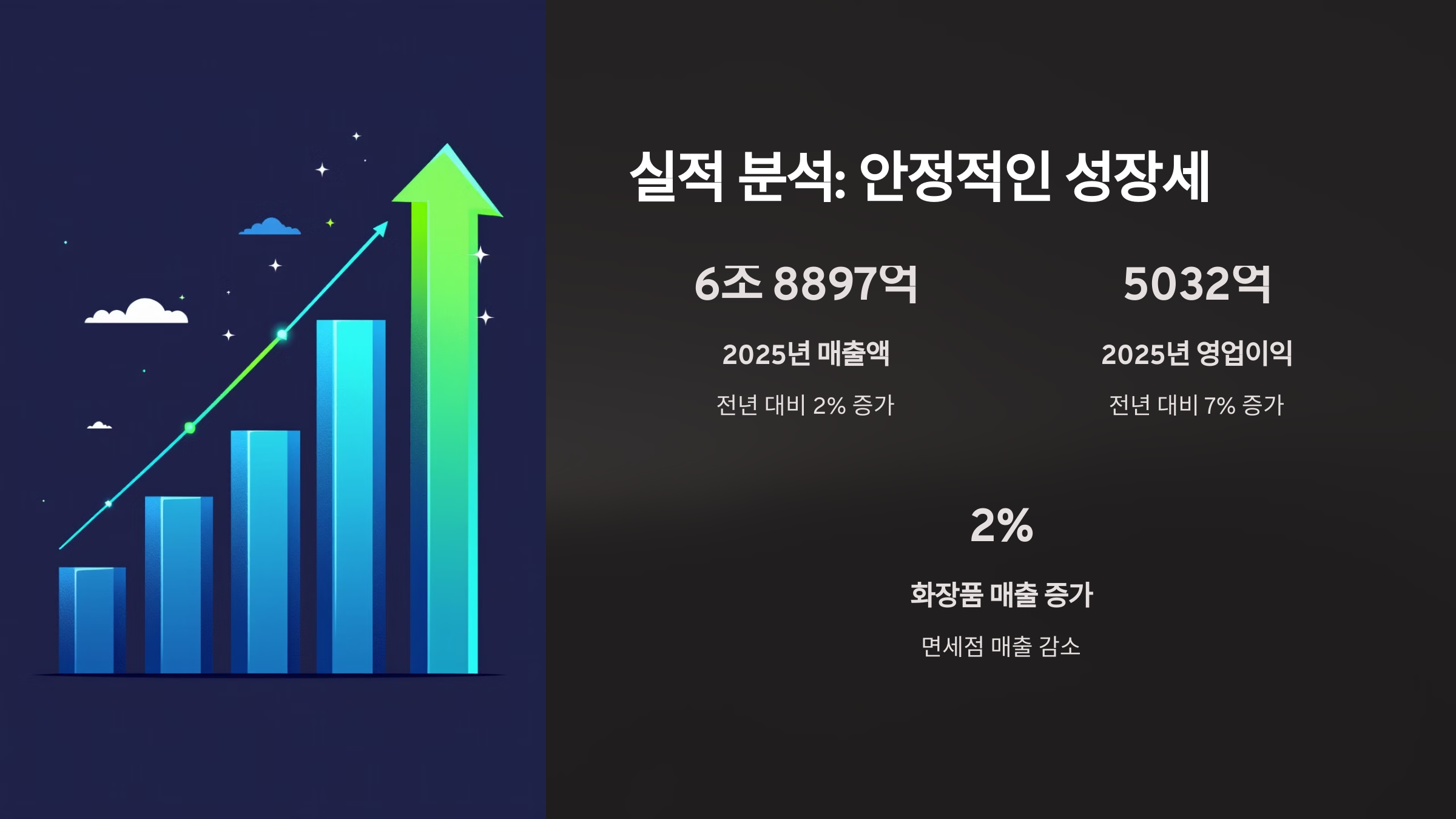 • 2024년 실적: 화장품 부문 매출은 전년 대비 2% 증가했으나, 면세점 매출 감소와 중국 시장 부진이 영향을 미쳤습니다.