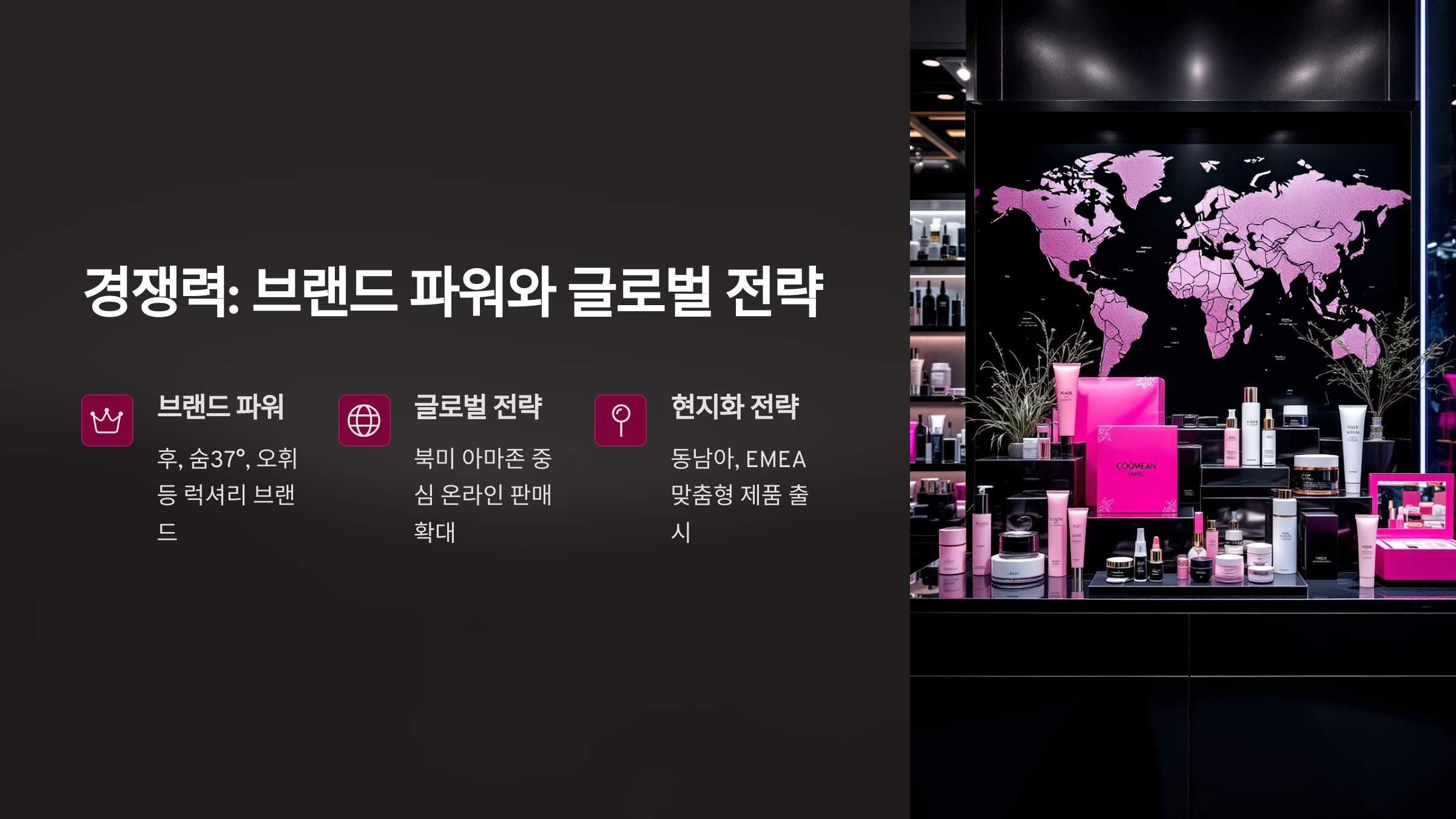 • 브랜드 파워: 후, 숨 37°, 오휘 등 럭셔리 화장품 브랜드의 글로벌 입지 강화.
