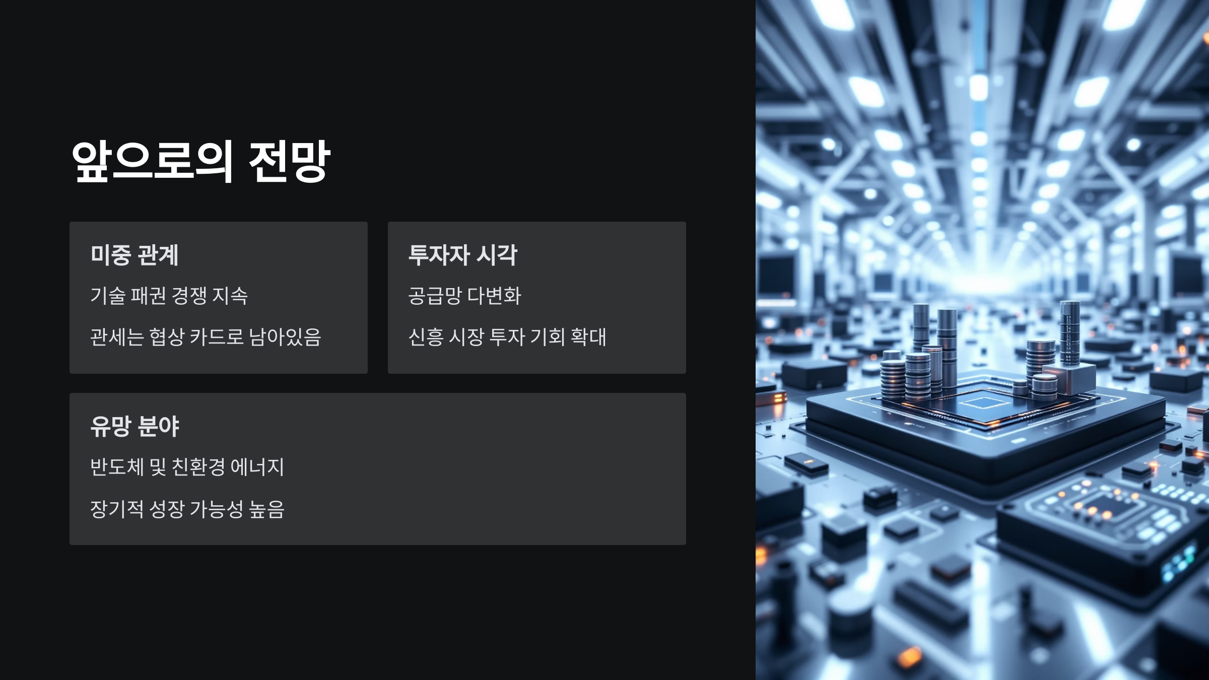 💡 투자 팁: 반도체 및 친환경 에너지 분야는 미중 갈등 속에서도 장기적으로 성장 가능성이 높은 섹터로 평가됩니다.