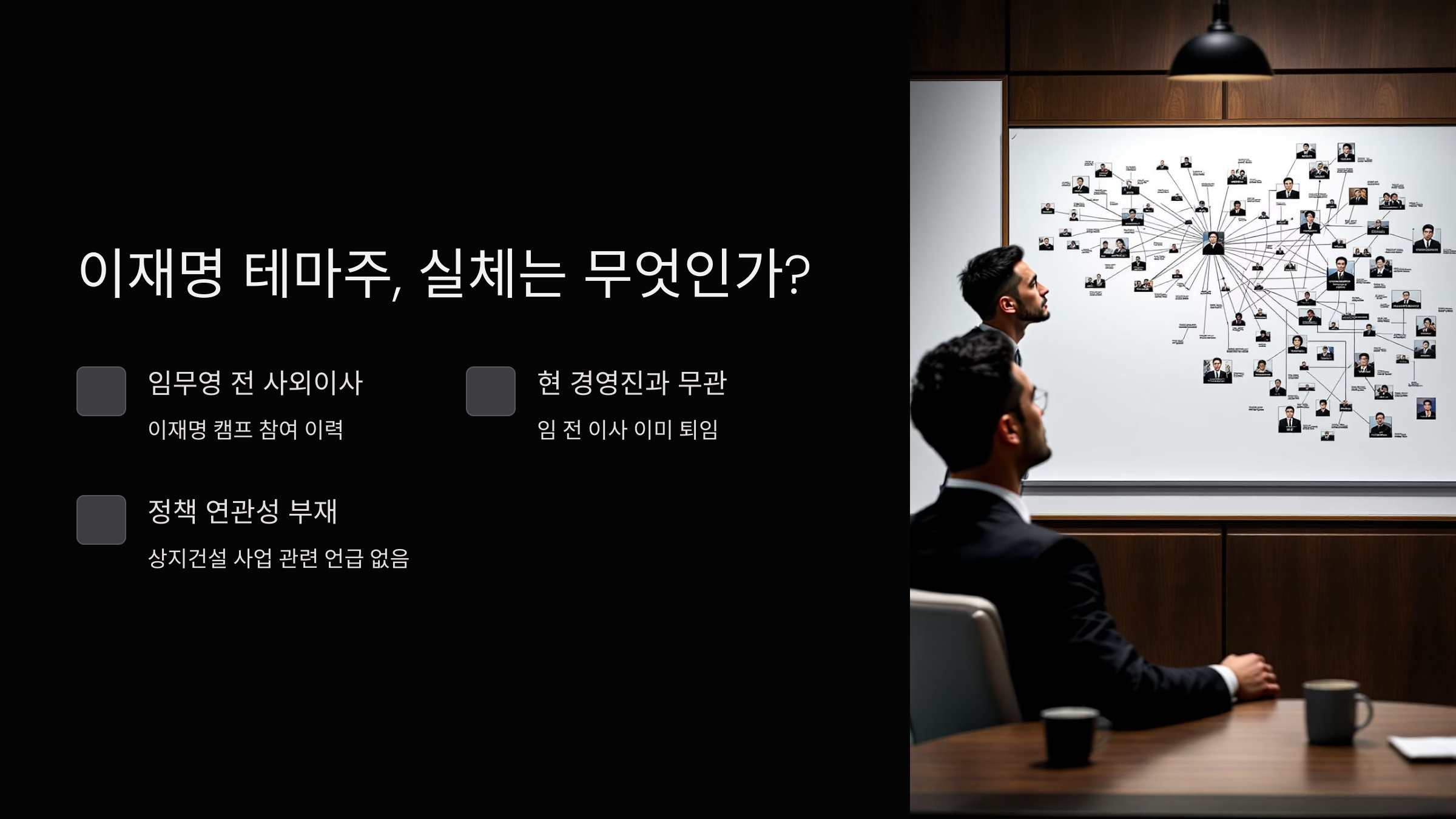 상지건설이 이재명 테마주로 묶인 이유는 단 하나, 과거 임무영 전 사외이사가 이재명 전 대표 캠프에 참여한 이력이 있다는 점입니다.