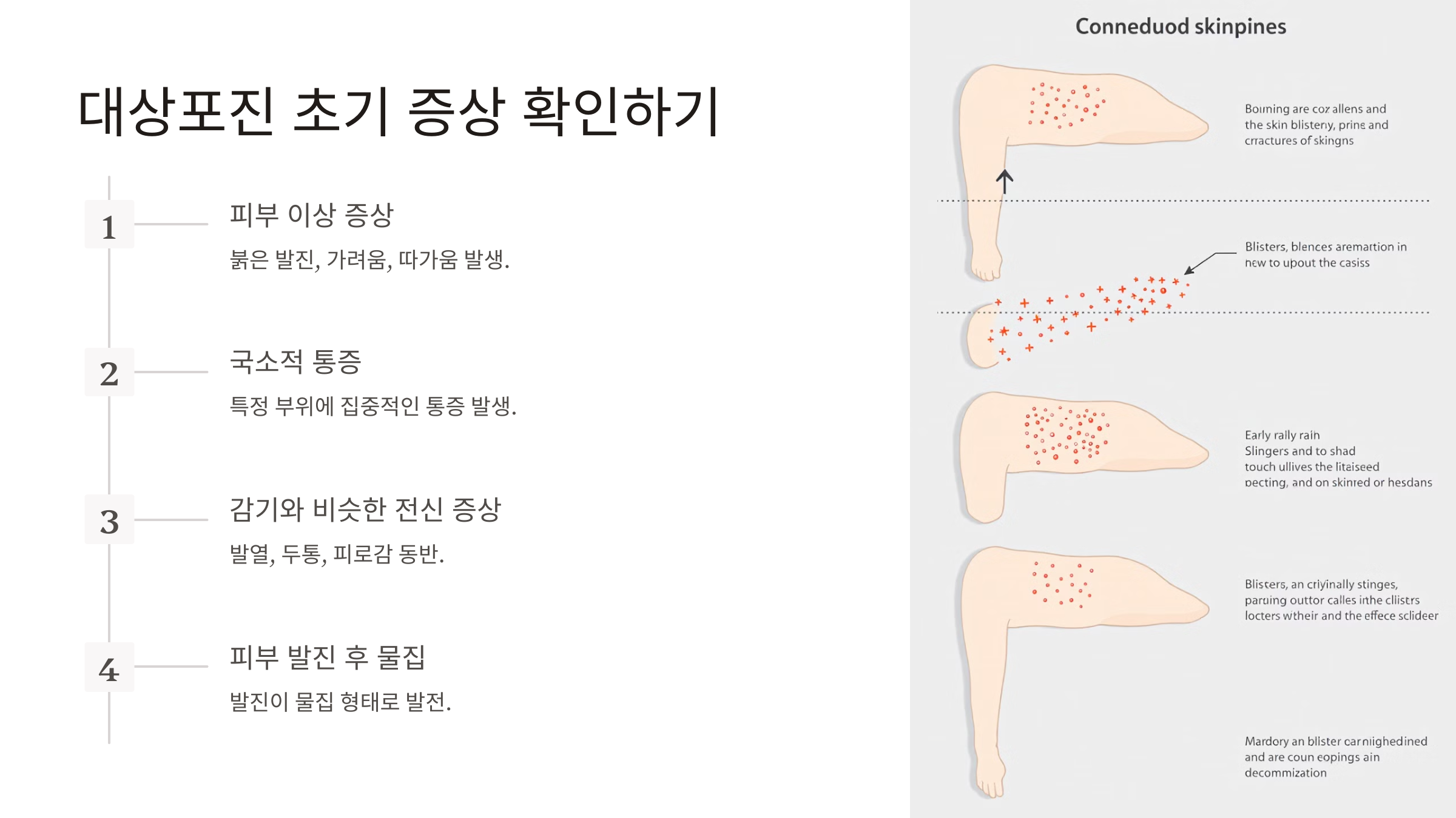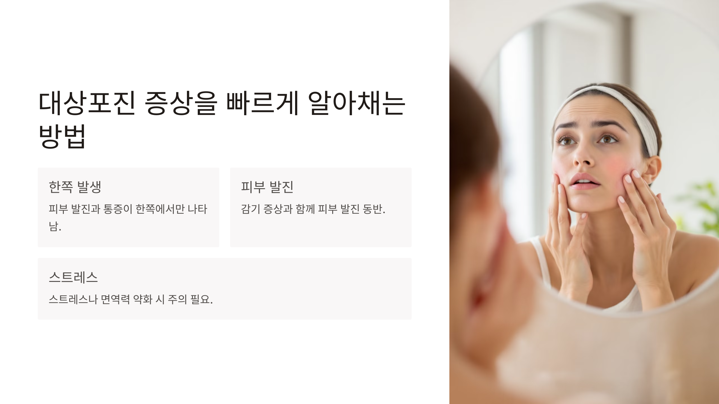 A3. 초기 증상이 경미하거나 명확하지 않은 경우도 있습니다. 하지만 대부분 피부 발진과 통증이 주요 신호로 나타납니다.