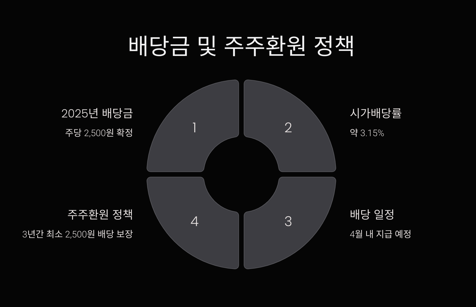 2025~2027년 3년간 최소 2,500원 배당 보장, 자사주 50% 소각(전체의 2%) 등 적극적인 주주가치 제고 정책을 추진합니다.