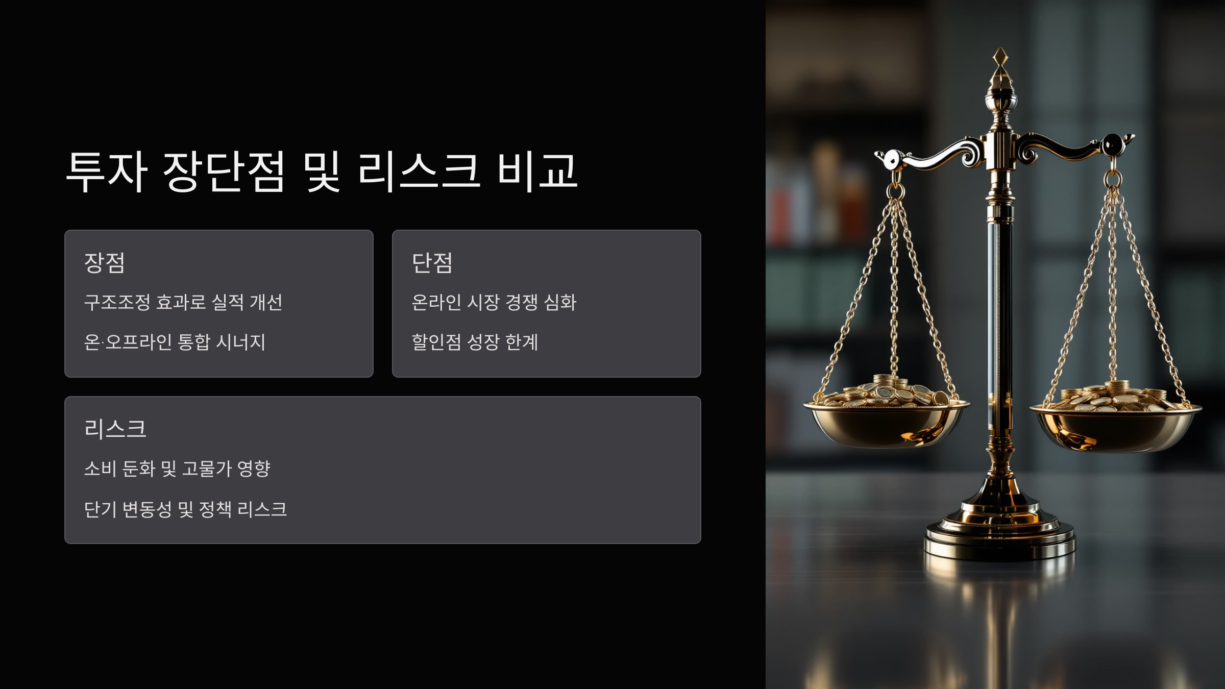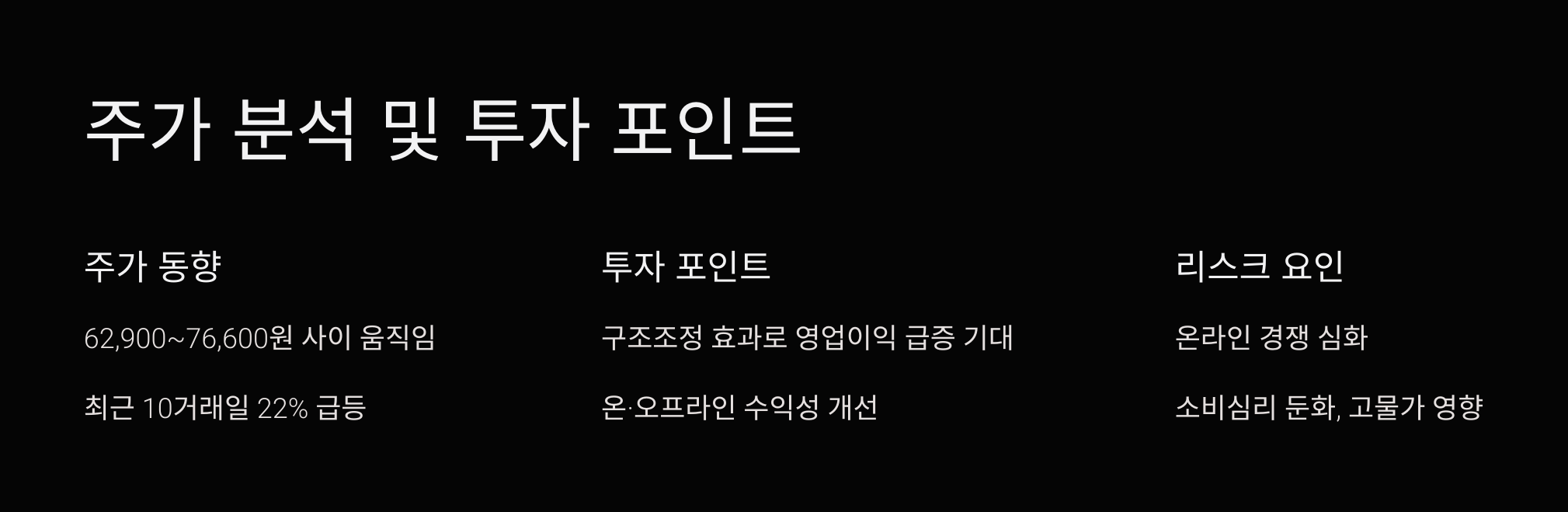 온라인 시장 경쟁, 소비 둔화 등 리스크는 여전하지만, 스타벅스코리아 등 자회사 성장, 배당금 인상, 자사주 소각 등 주주가치 제고 정책이 투자 매력도를 크게 끌어올리고 있습니다.