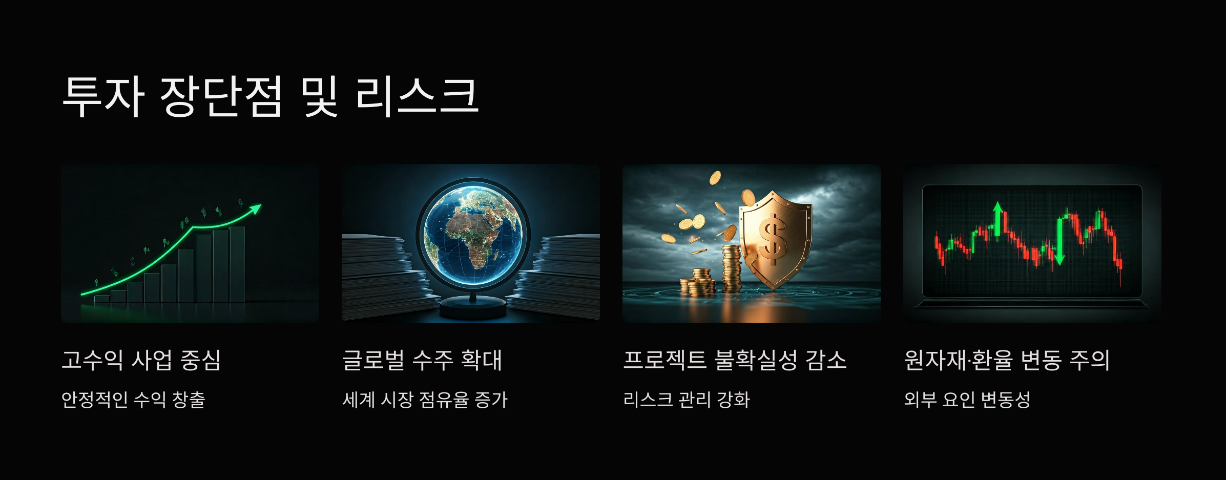 글로벌 시장 수주 확대, ‘원전의 TSMC’ 도약 원자재·환율 변동, 경기 민감성