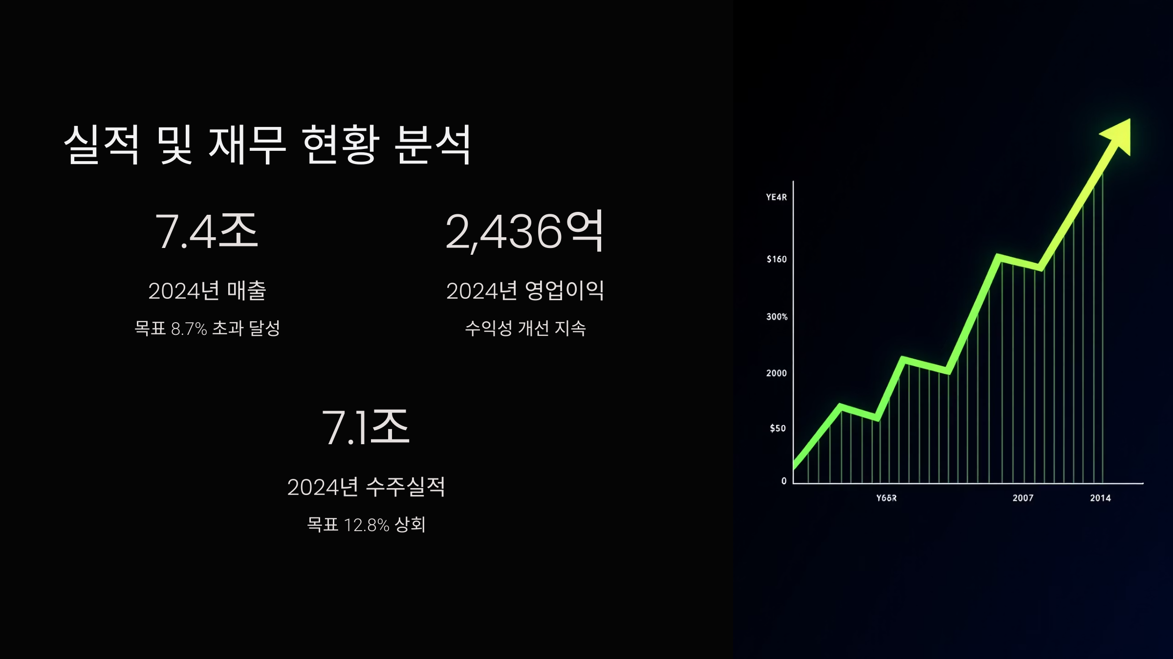 2025년 매출 목표는 6조 4,773억 원(전년 대비 -12%), 영업이익 3,732억 원(+53%)으로, 매출은 다소 보수적으로 제시됐으나 수익성 중심의 선별적 수주 전략으로 영업이익률이 3.3%→5.8%로 크게 개선될 전망입니다.
