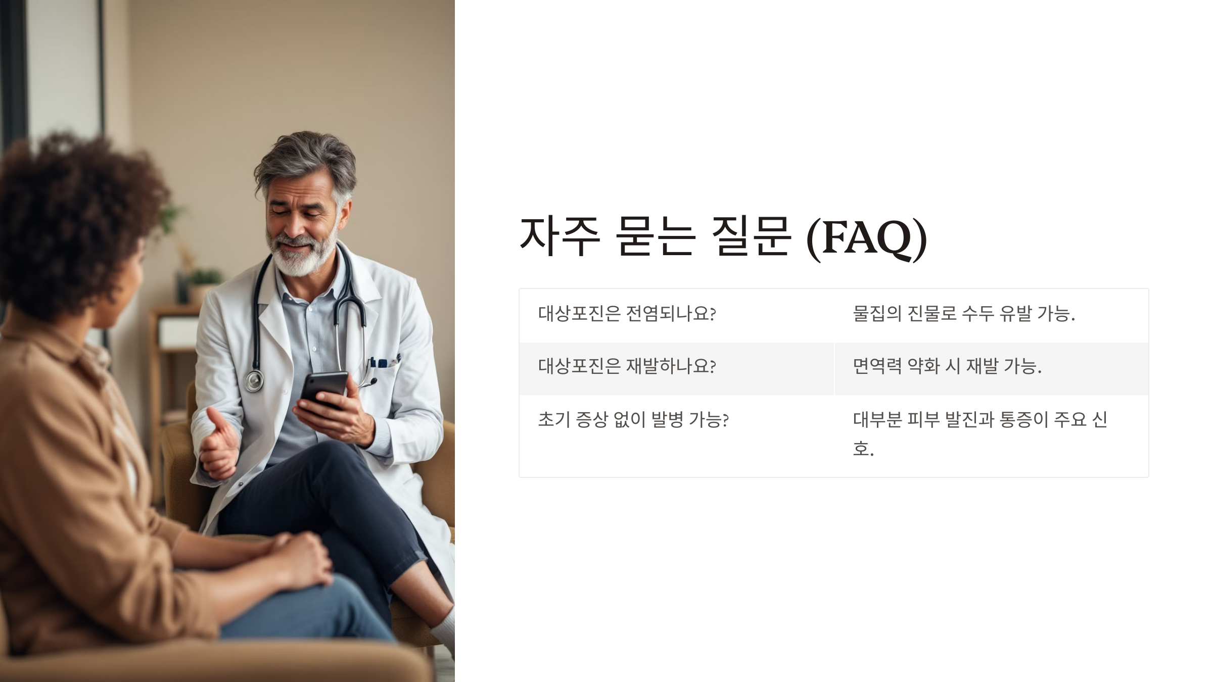 A3. 초기 증상이 경미하거나 명확하지 않은 경우도 있습니다. 하지만 대부분 피부 발진과 통증이 주요 신호로 나타납니다.