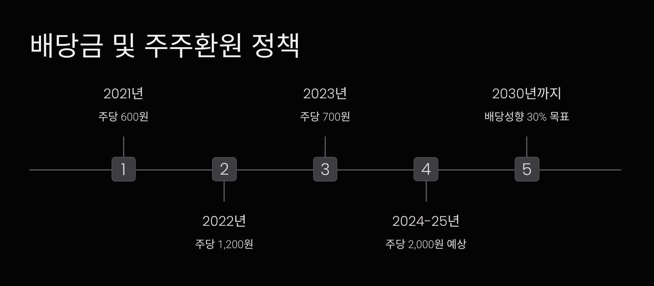 2030년까지 배당성향 30% 또는 시가배당률 5% 이상, 추가 자사주 매입·소각까지 포함한 공격적 주주환원 정책을 추진 중입니다.