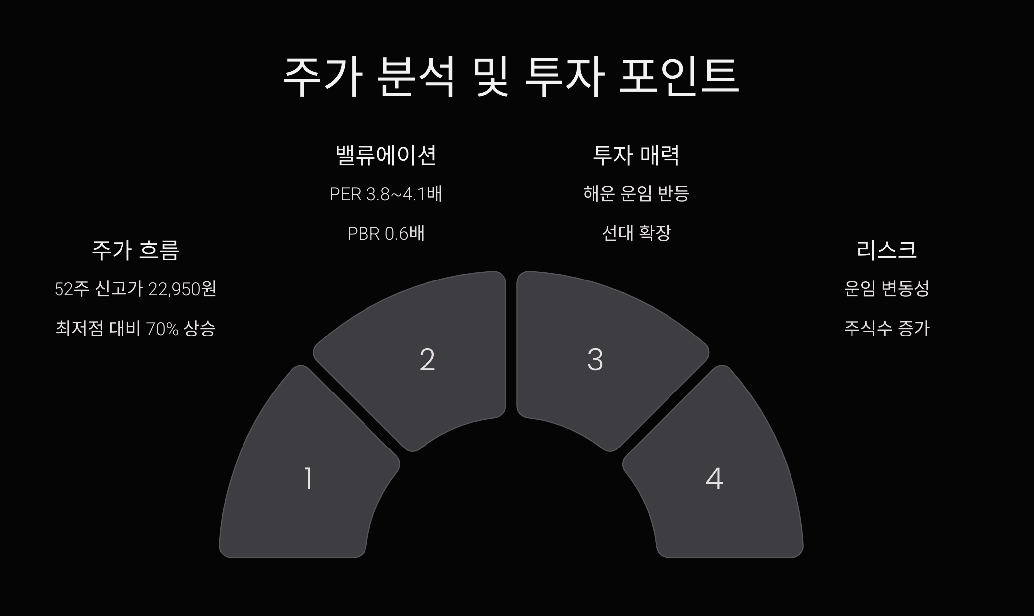 2025년 기준 PER 3.8~4.1배, PBR 0.6배로, 해운업종 내에서도 저평가 구간에 있습니다.