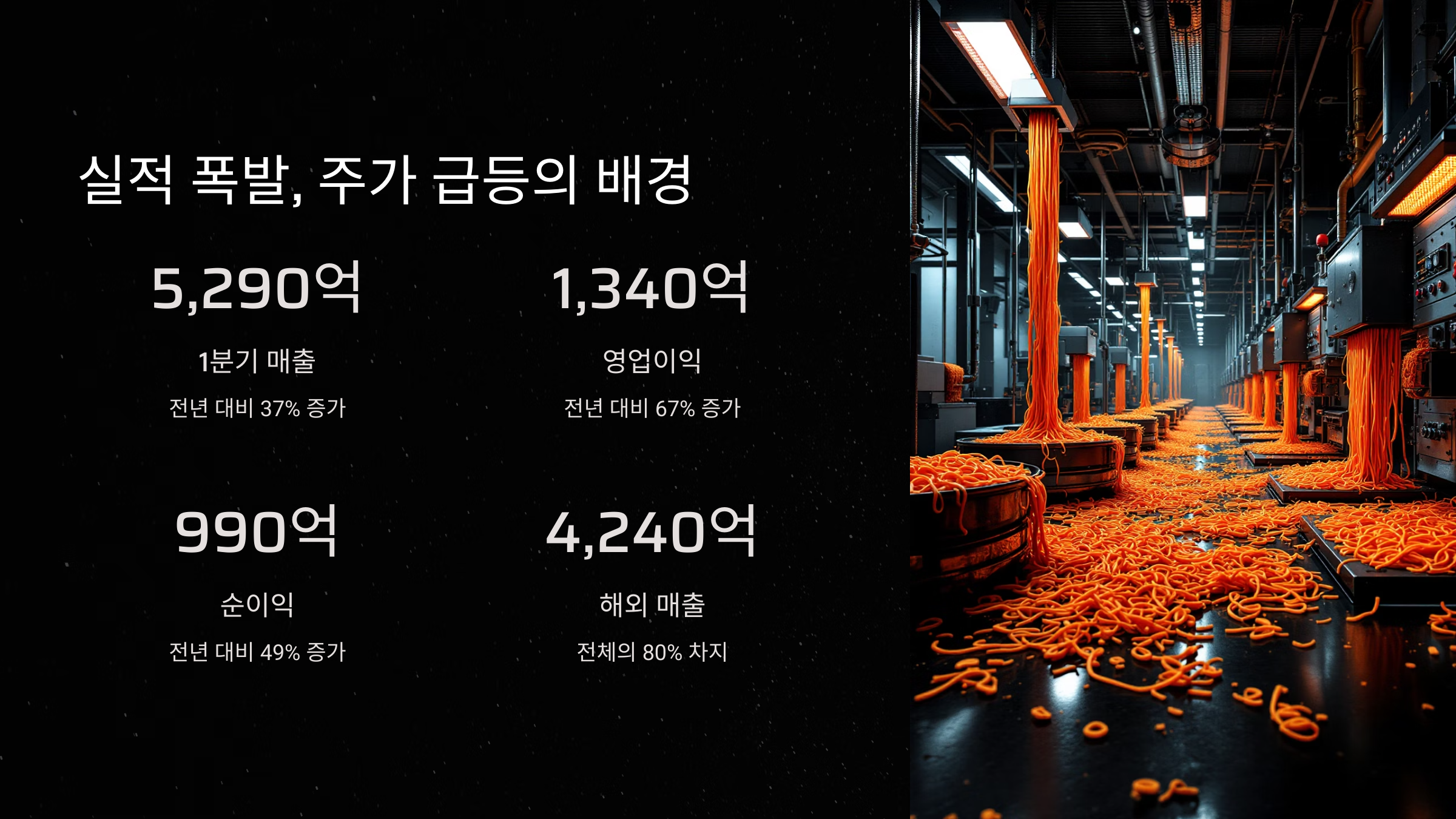 삼양식품은 1분기 매출 5,290억 원(+37%), 영업이익 1,340억 원(+67%)을 기록하며 분기 기준 처음으로 영업이익 1,000억 원을 돌파했습니다.