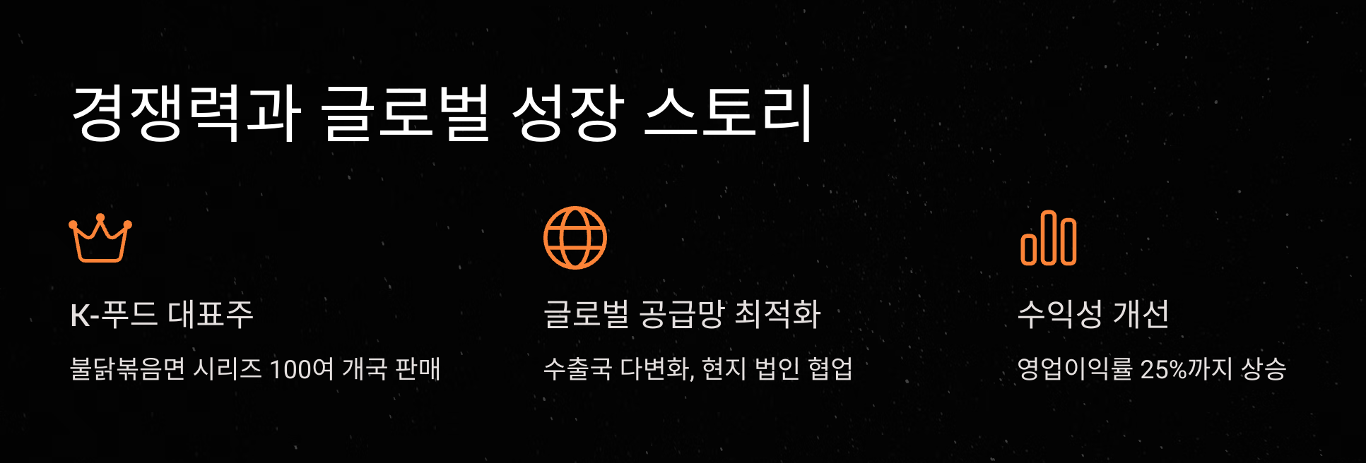 불닭 시리즈에 편중된 매출 구조는 약점이지만, 삼양식품은 건면·소스·냉동식품 등으로 제품군을 확장하고 있습니다.