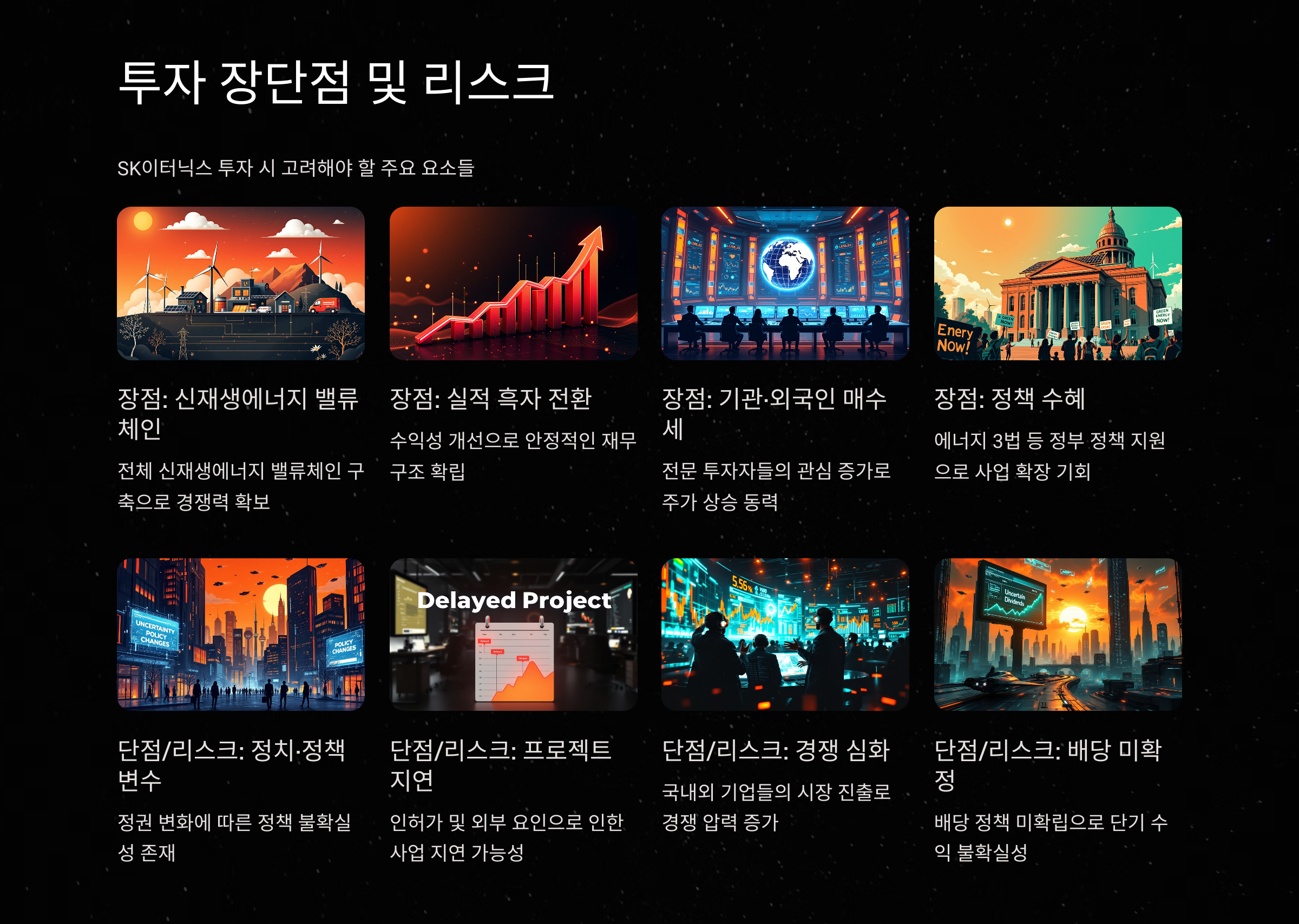 SK이터닉스는 태양광·풍력·연료전지 등 신재생에너지 밸류체인, 대형 프로젝트 매출 인식, 정책 수혜, 실적 반전 등으로 중장기 성장 잠재력이 매우 높은 기업입니다.