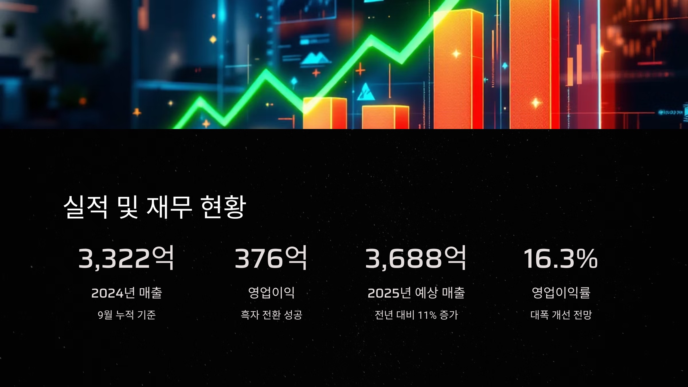 2025년에는 매출 3,688억 원(+11%), 영업이익 514억 원(+37%)이 예상되며, 영업이익률은 16.3%로 대폭 개선될 전망입니다.