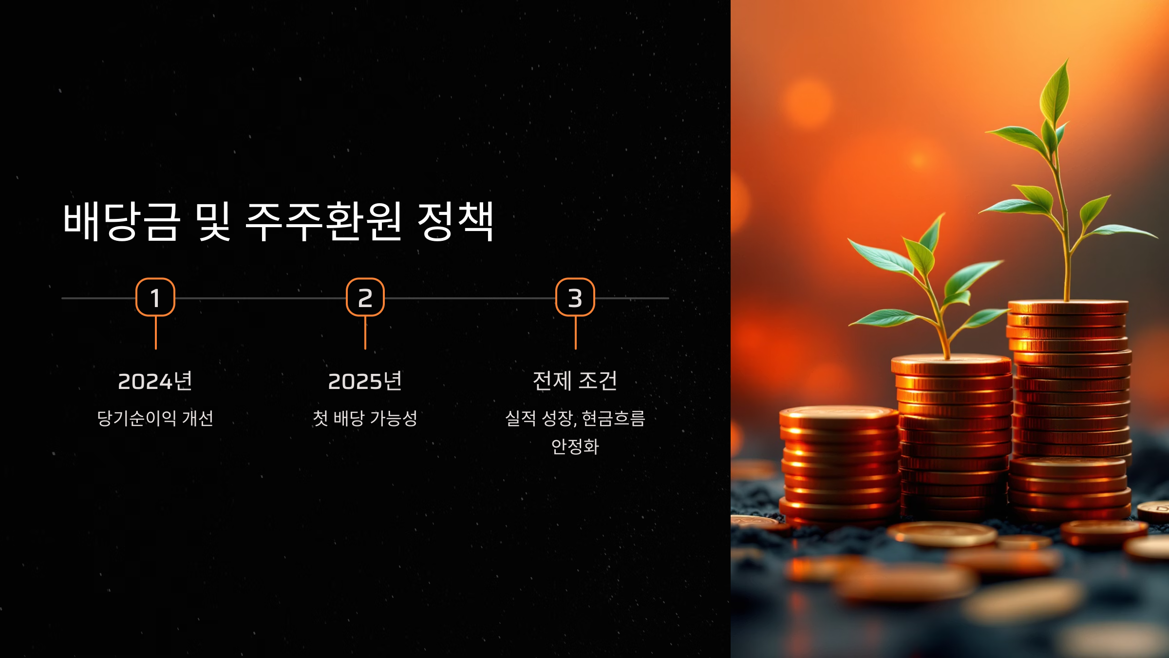 주주총회 및 이사회 결의에 따라 2025년 첫 배당이 이뤄질 가능성이 높아졌으며, 실적 성장과 현금흐름 안정화가 전제 조건입니다.