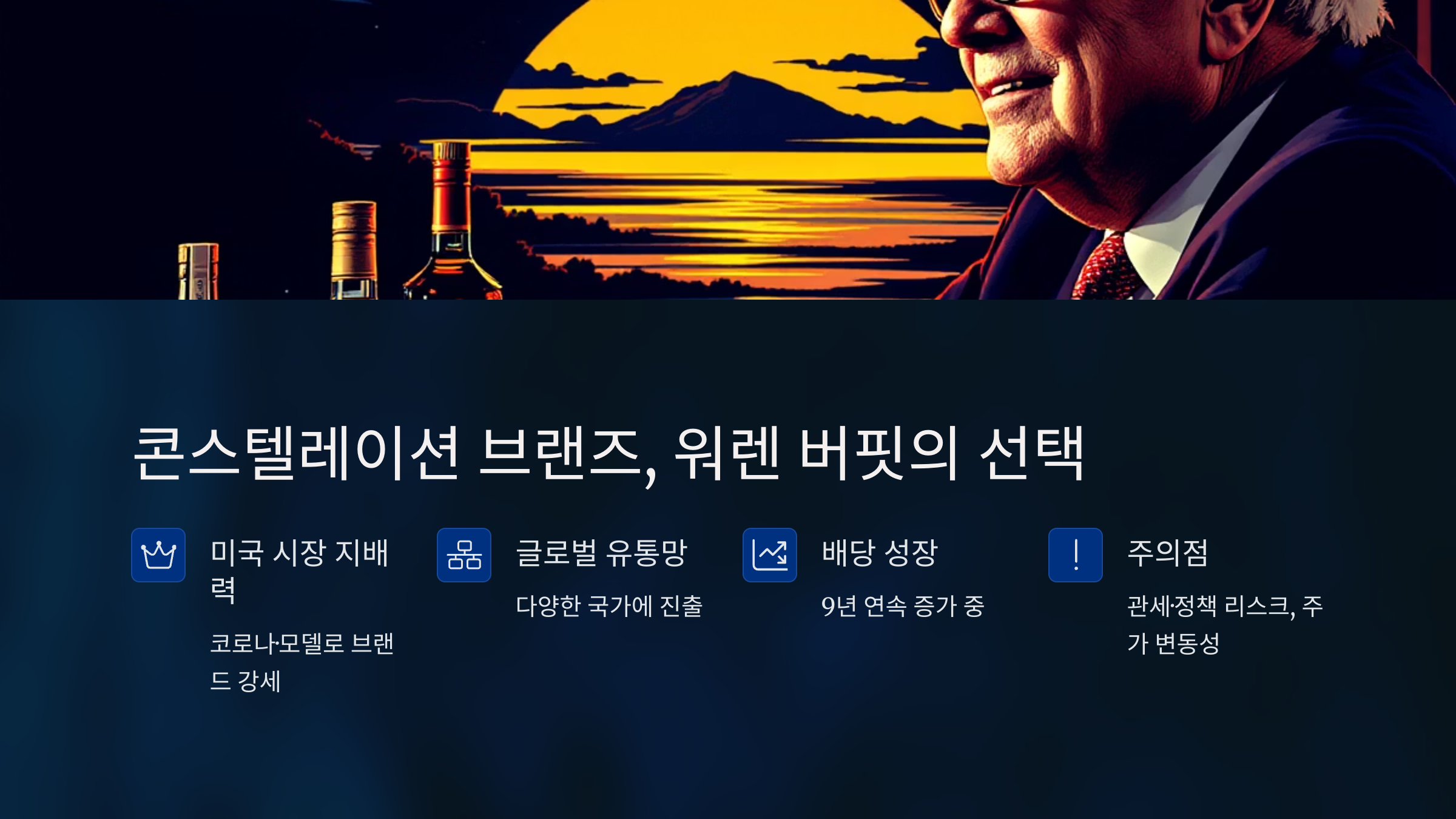 콘스텔레이션 브랜즈는 프리미엄 맥주 브랜드의 미국 시장 지배력, 글로벌 유통망, 9년 연속 배당 증가, 워렌 버핏의 신뢰 등 강력한 투자 포인트를 갖춘 글로벌 주류 대장주다.