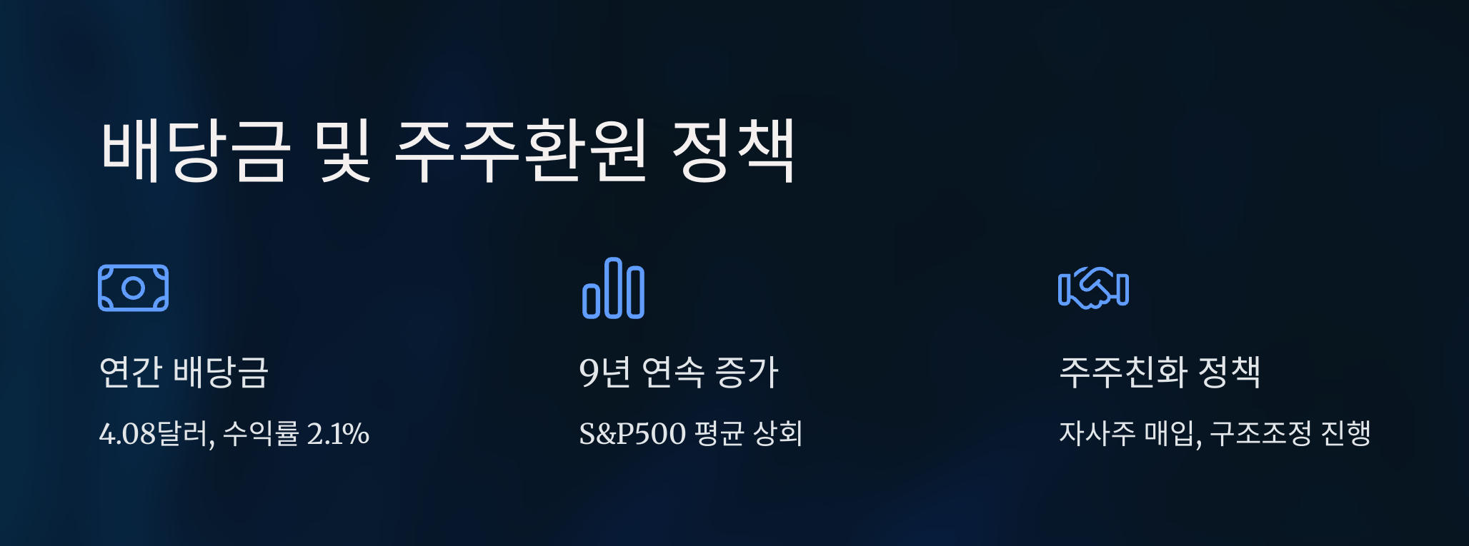 2025년 기준 연간 배당금은 4.08달러, 배당수익률 2.1%로 S&P500 평균을 상회한다.