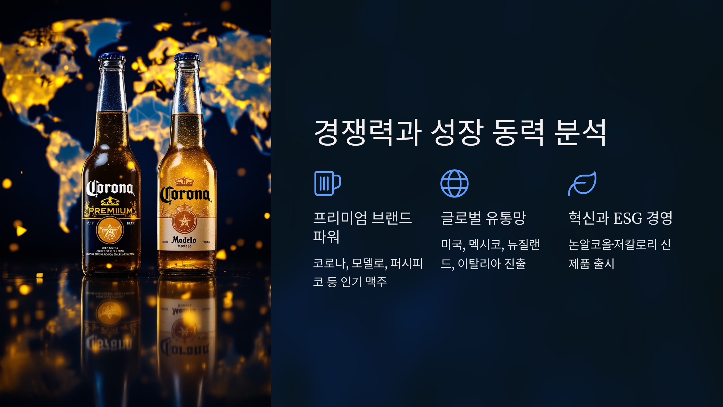 코로나·모델로 등 프리미엄 맥주와 와인, 스피릿 브랜드를 보유한 이 기업은 미국·멕시코·이탈리아 등 글로벌 시장에서 독보적인 입지를 구축해왔다.