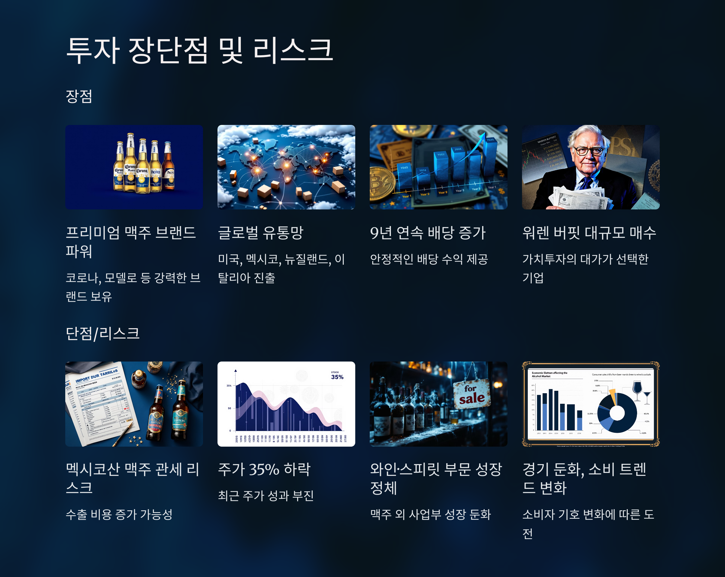 A1. 미국 맥주 시장 1위 브랜드(코로나·모델로) 지배력, 프리미엄 전략, 안정적 현금흐름, 9년 연속 배당 증가 등 내재가치에 대한 신뢰 때문이다.
