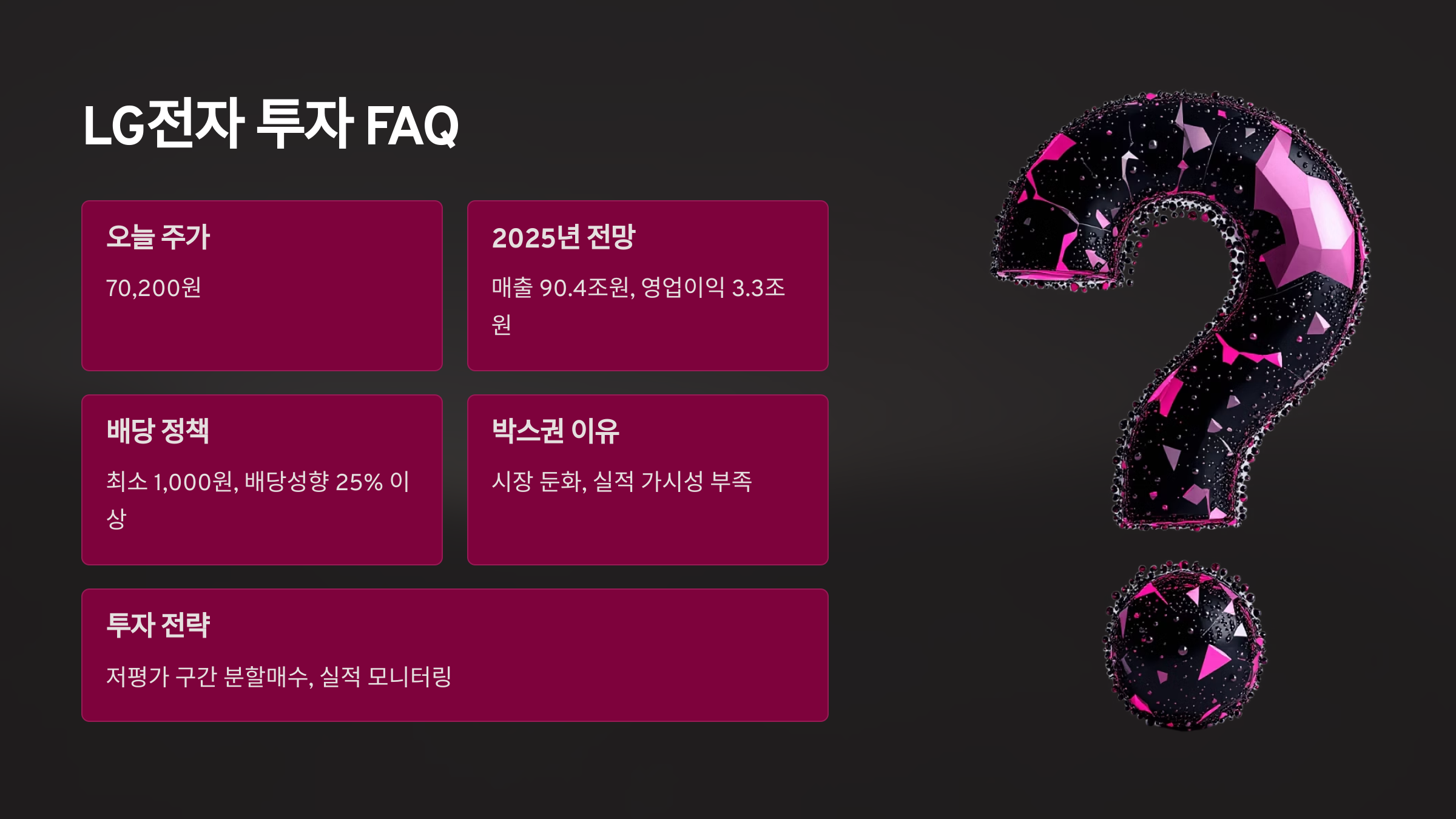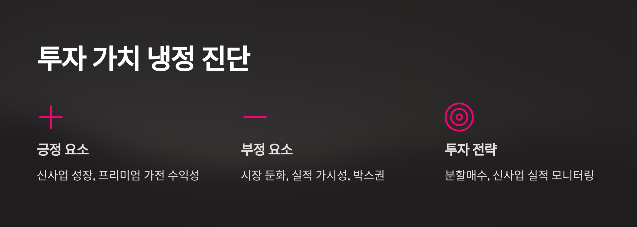 그러나 글로벌 가전 시장 둔화, 신사업 실적 가시성, 단기 박스권 등은 여전히 투자 판단의 핵심 리스크입니다.
