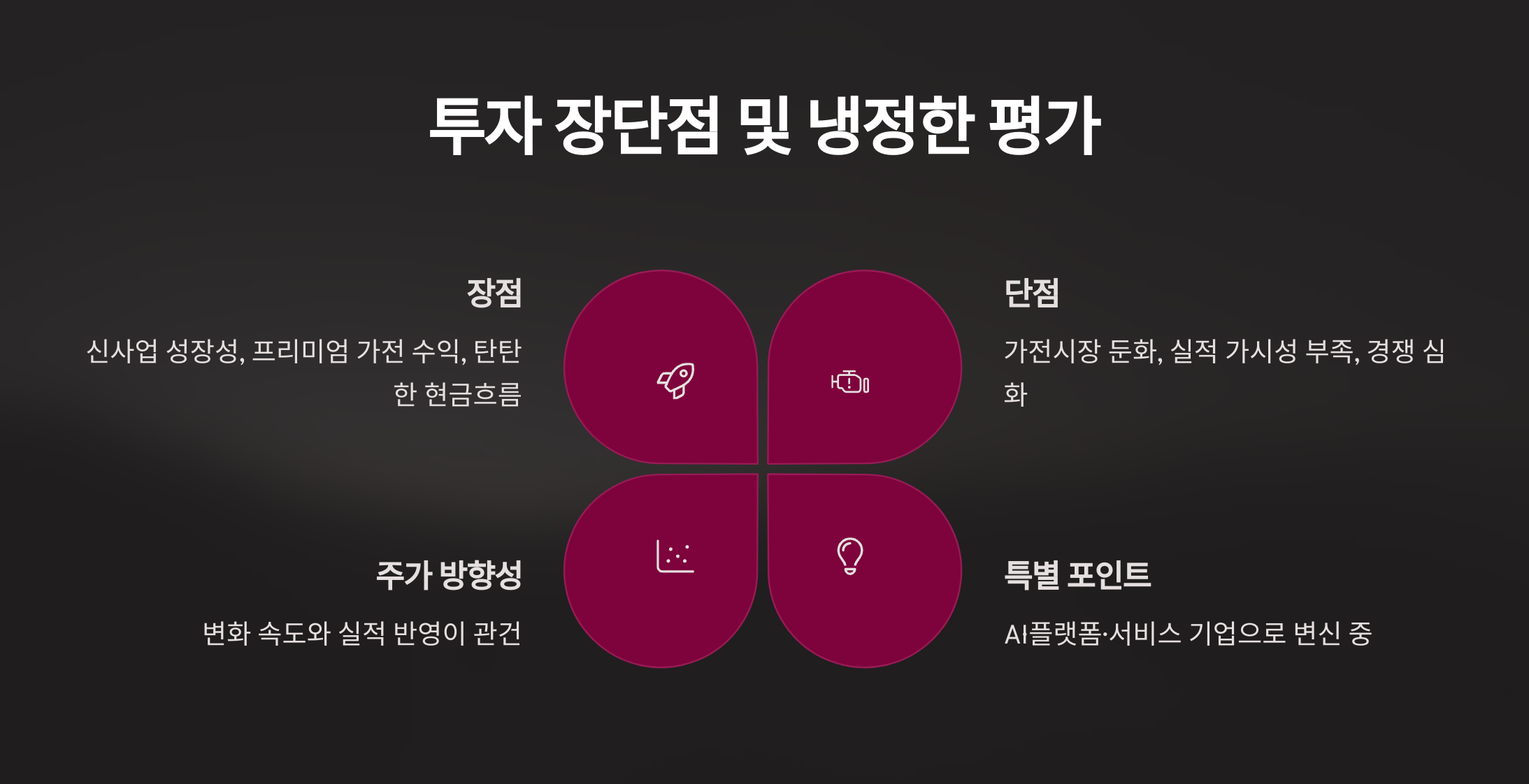 그러나 글로벌 가전 시장 둔화, 신사업 실적 가시성, 단기 박스권 등은 여전히 투자 판단의 핵심 리스크입니다.