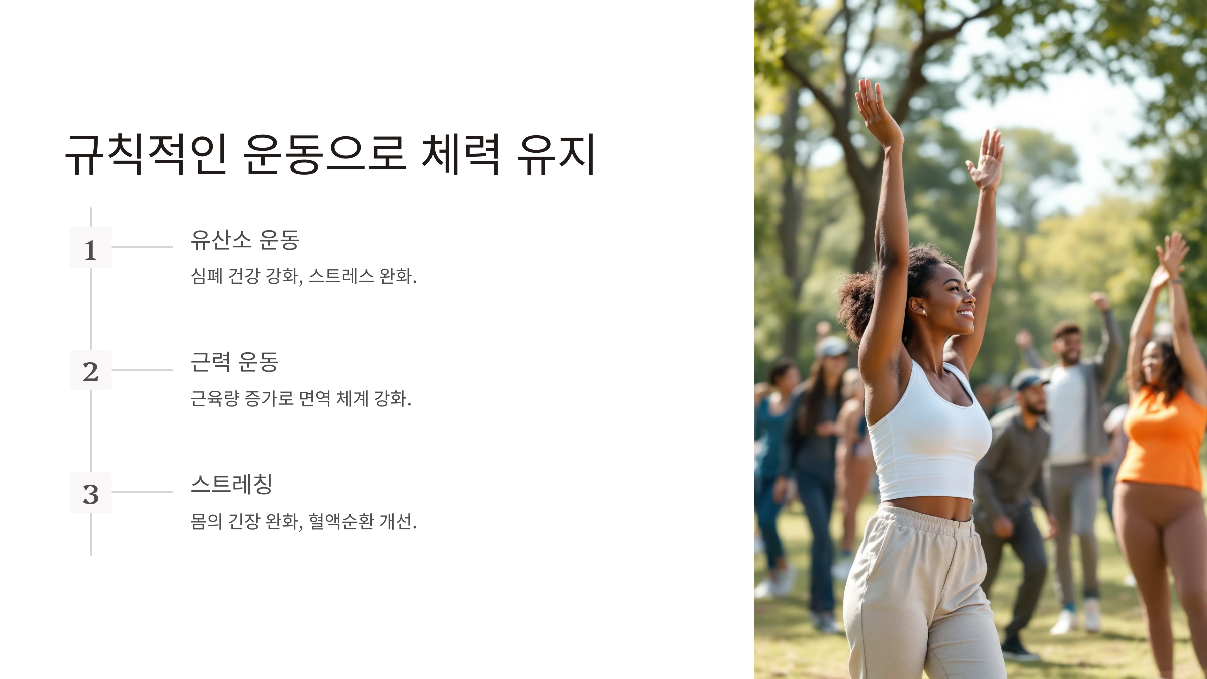 • 근력 운동: 근육량을 늘려 면역 체계를 튼튼하게 만들어줍니다.