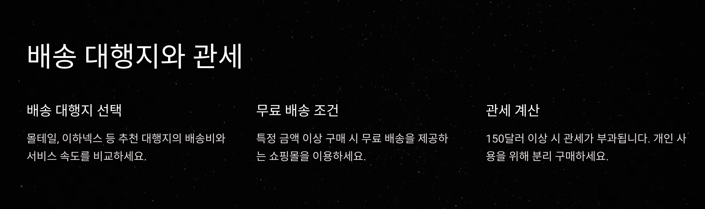 • 관세 계산하기: 해외 직구 시, 세금과 관세를 고려해야 합니다. 한국으로 수입하는 물품은 150달러 이상 시 관세가 부과되며, 개인 사용을 위해 분리 구매하는 것이 관세 절약에 도움이 됩니다.