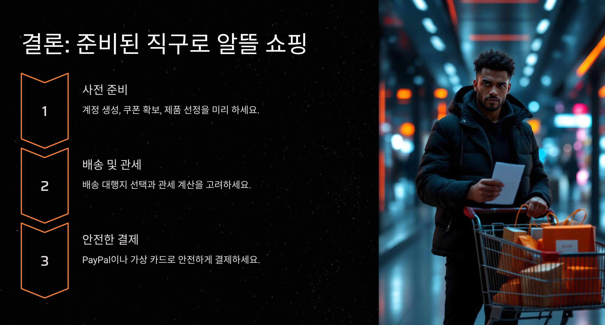 • 배송 대행지 선택: 해외 직구의 경우 각국의 배송 대행지를 통해 제품을 받을 수 있습니다. 추천 대행지로는 몰테일, 이하넥스 등이 있으며, 각 대행지의 배송비와 서비스 속도를 비교해 보세요.