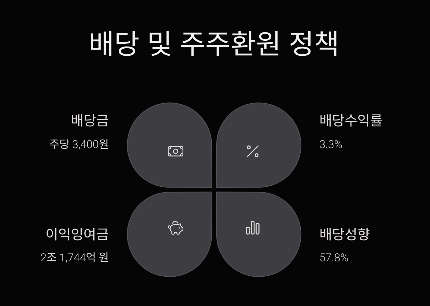 보통주 1주당 3,400원(전년 3,300원 대비 100원↑), 배당수익률 3.3%, 배당성향 57.8%로 국내 소비재 대형주 중 상위권입니다.