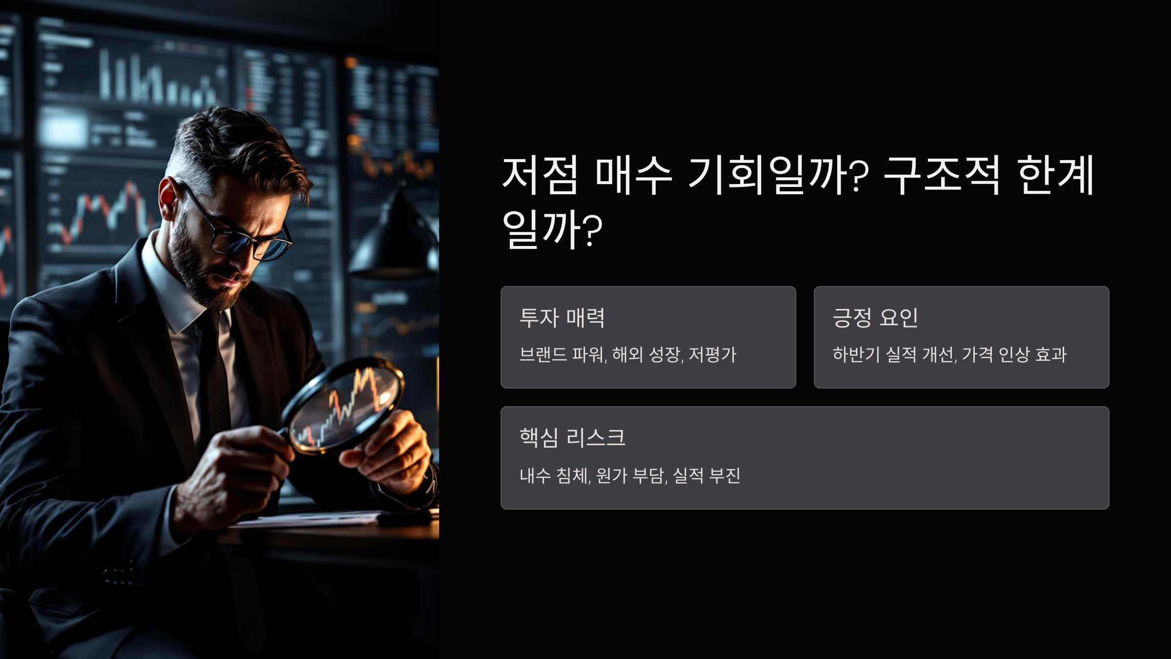 단기 실적 부진과 내수 침체, 재무 부담 등은 반드시 체크해야 할 리스크입니다.