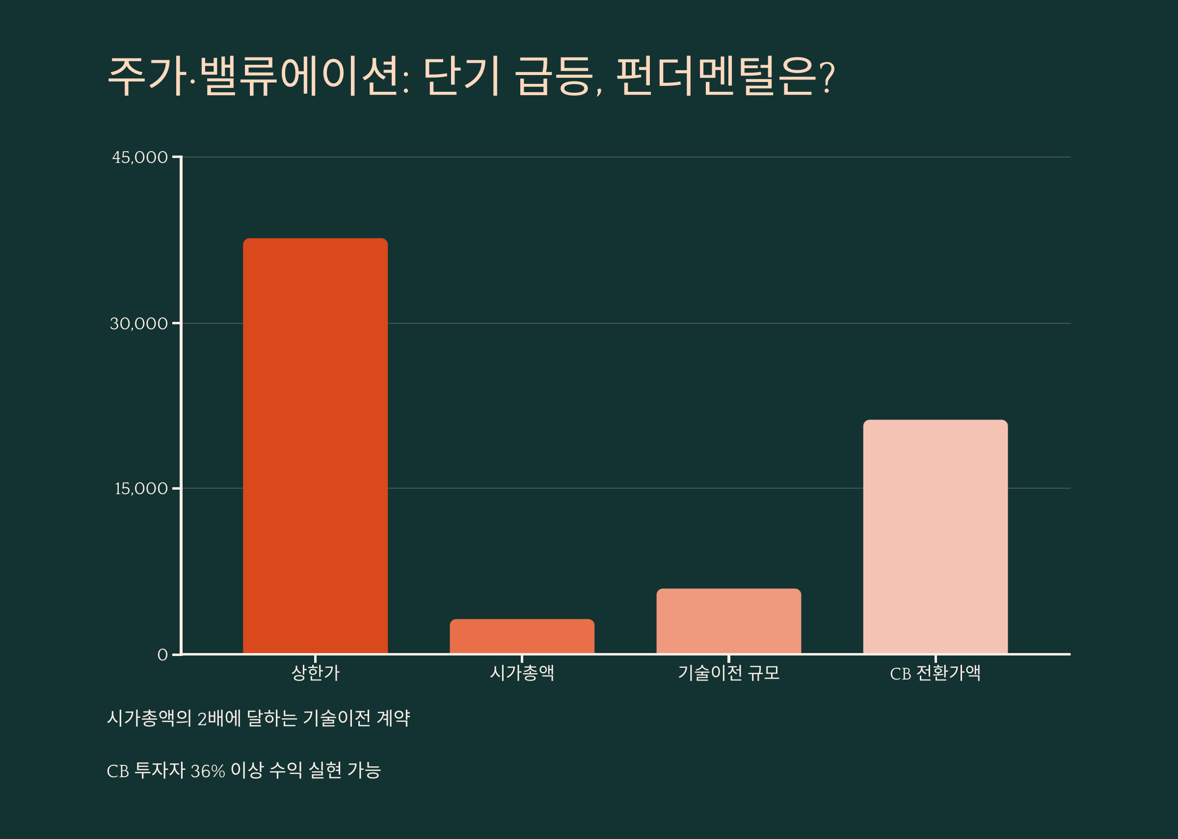 시가총액은 3,200억 원대까지 단숨에 뛰었으며, 기술이전 계약 규모(5,952억 원)는 시총의 2배에 달합니다.