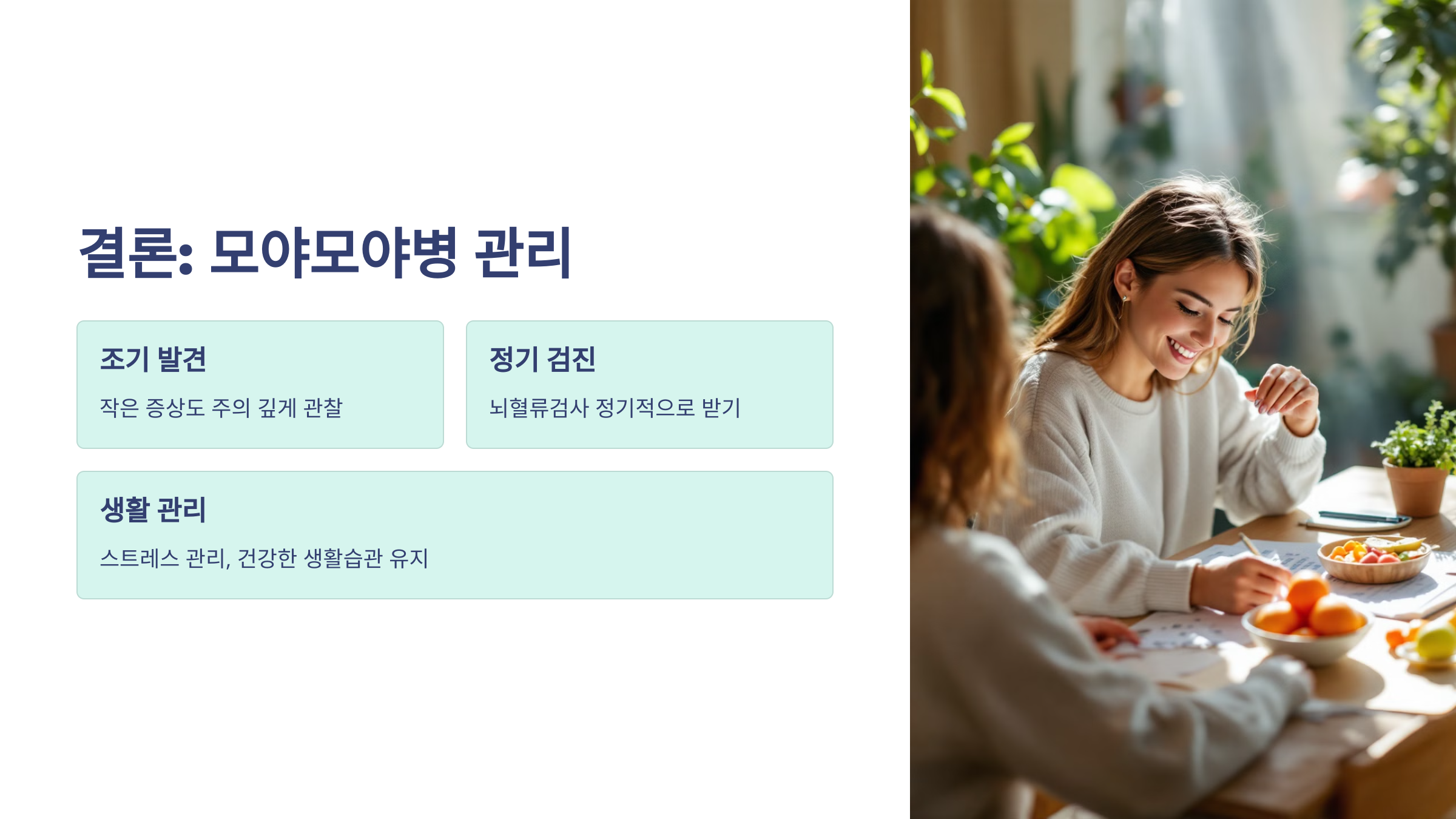 모야모야병은 조기에 발견하고 적절한 치료를 받으면 삶의 질을 유지할 수 있는 질환입니다. 초기 증상(두통, 일시적인 마비 등)을 간과하지 말고, 빠른 진단과 치료를 통해 뇌혈관 건강을 지켜야 합니다.
