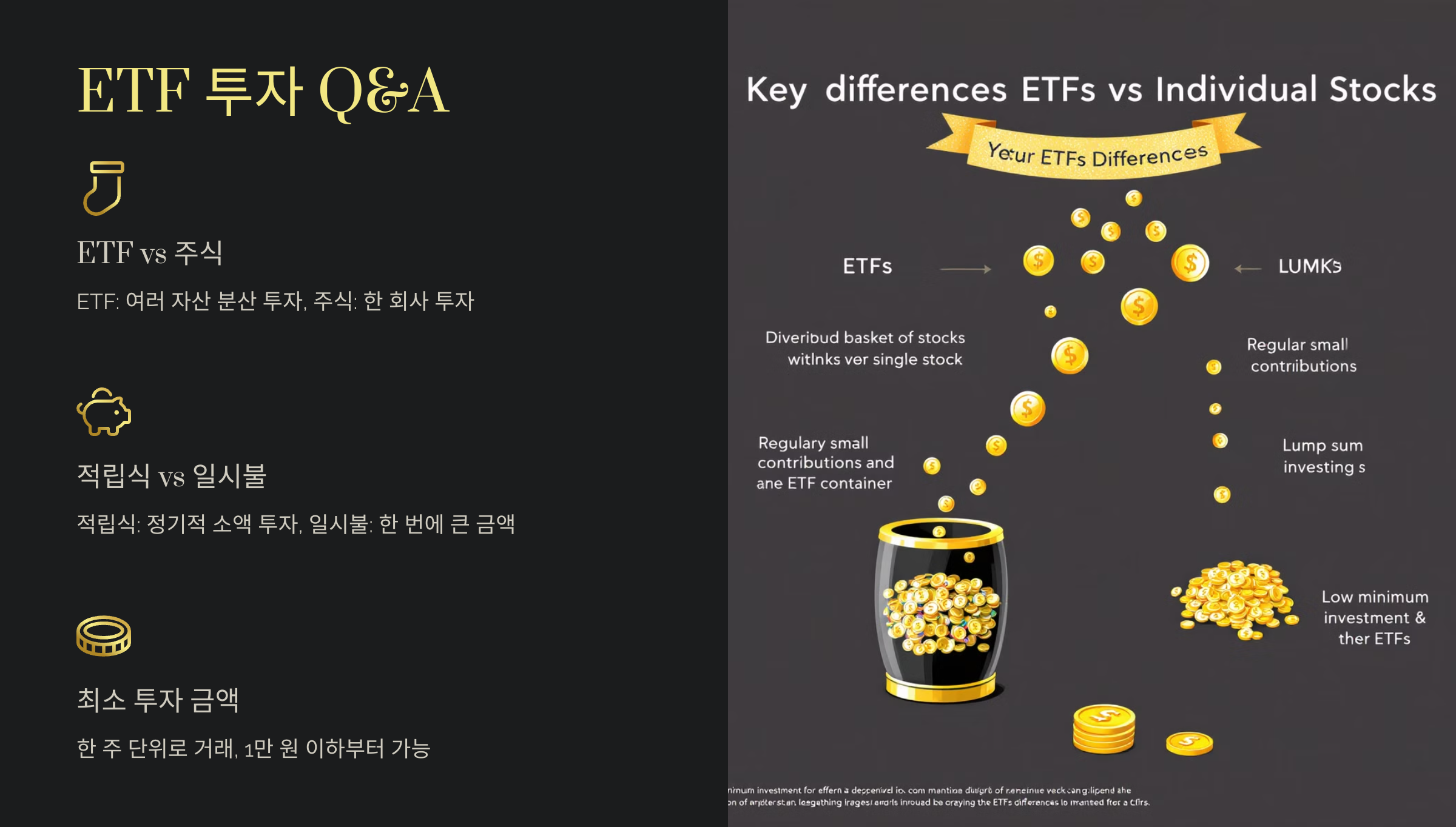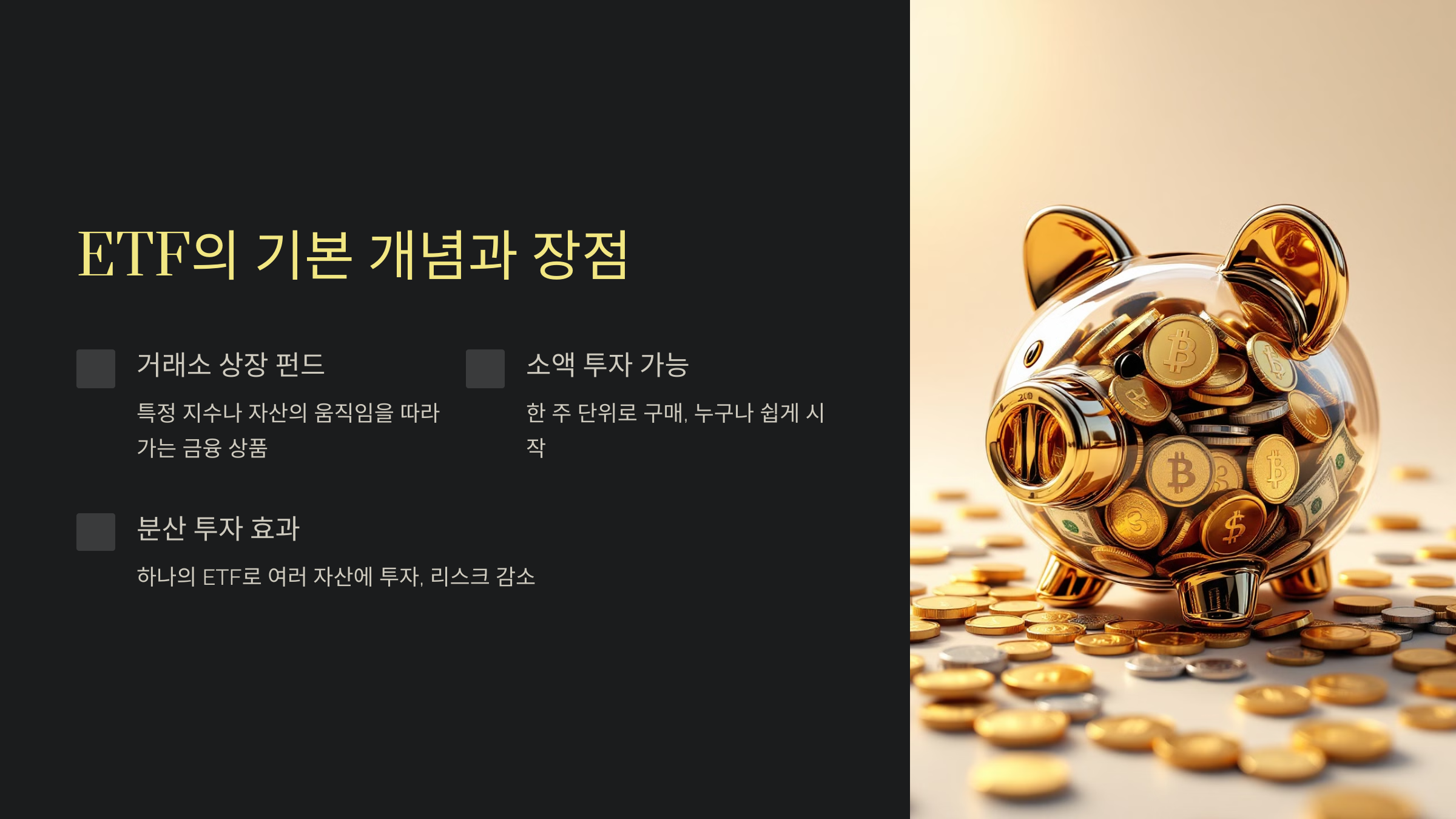 ETF는 낮은 진입 장벽, 분산 투자 효과, 거래 편의성 덕분에 초보 투자자에게 완벽한 금융 상품입니다.