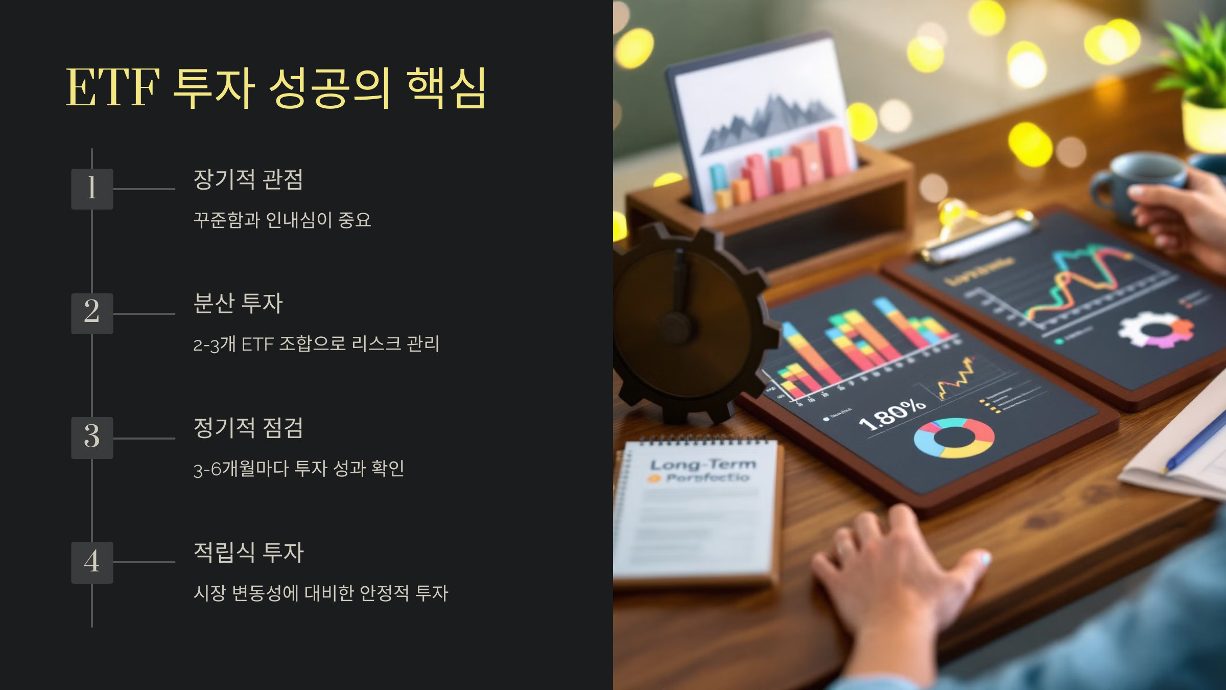 ETF 투자는 단순하면서도 체계적인 접근이 중요합니다. 다음의 단계별 전략을 참고하세요.