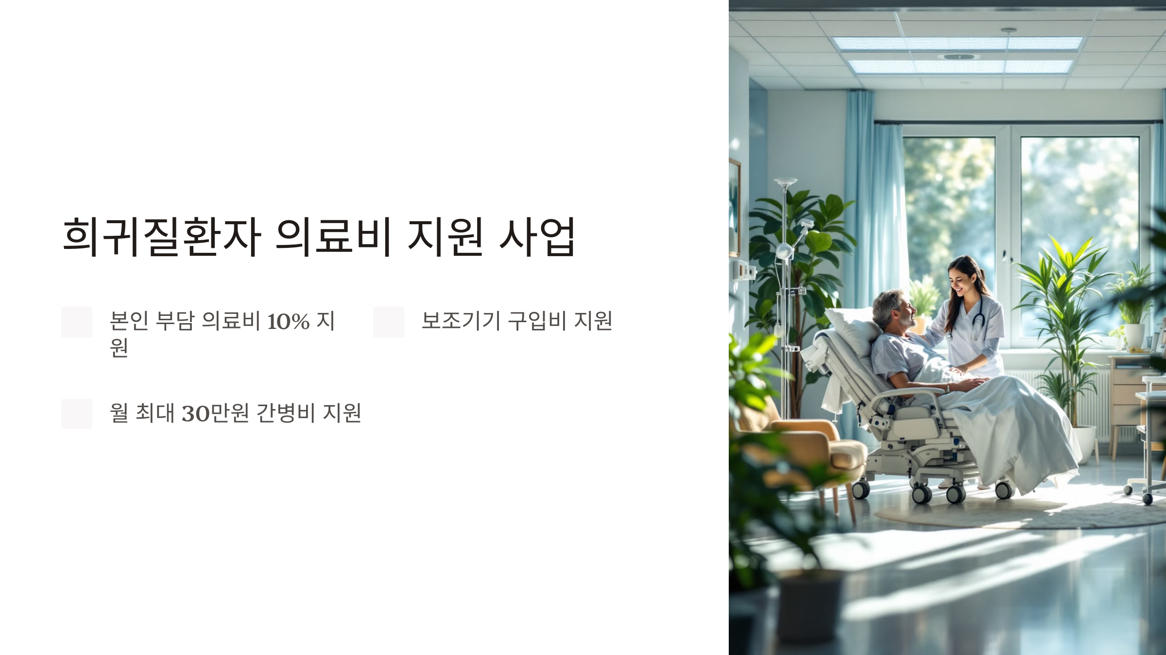 특히 희귀 질환자 의료비 지원 사업이나 건강보험 본인부담 상한제는 꼭 활용해야 할 제도입니다.