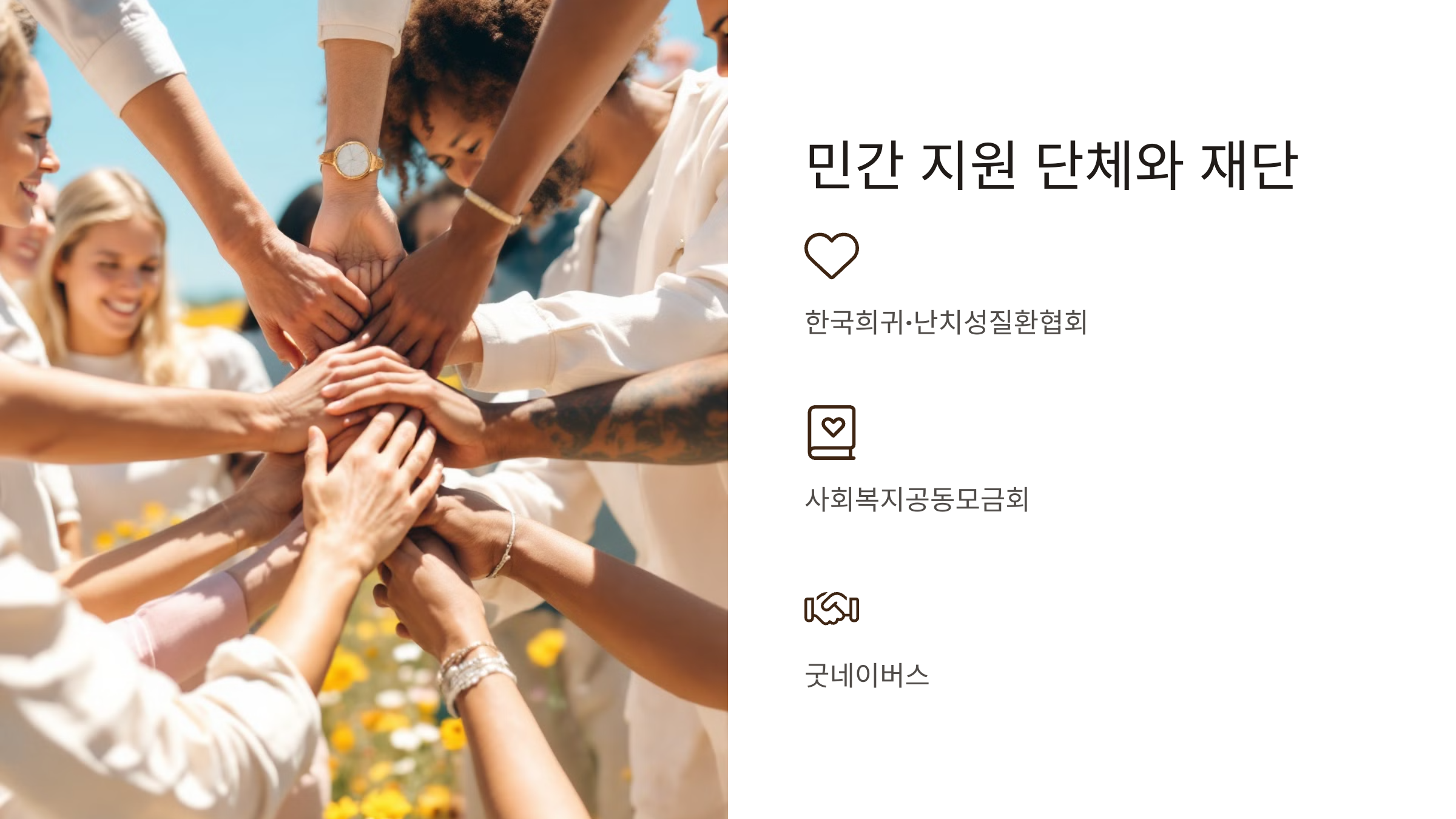 • 희귀 질환 환자 대상 치료비 및 생계비 지원