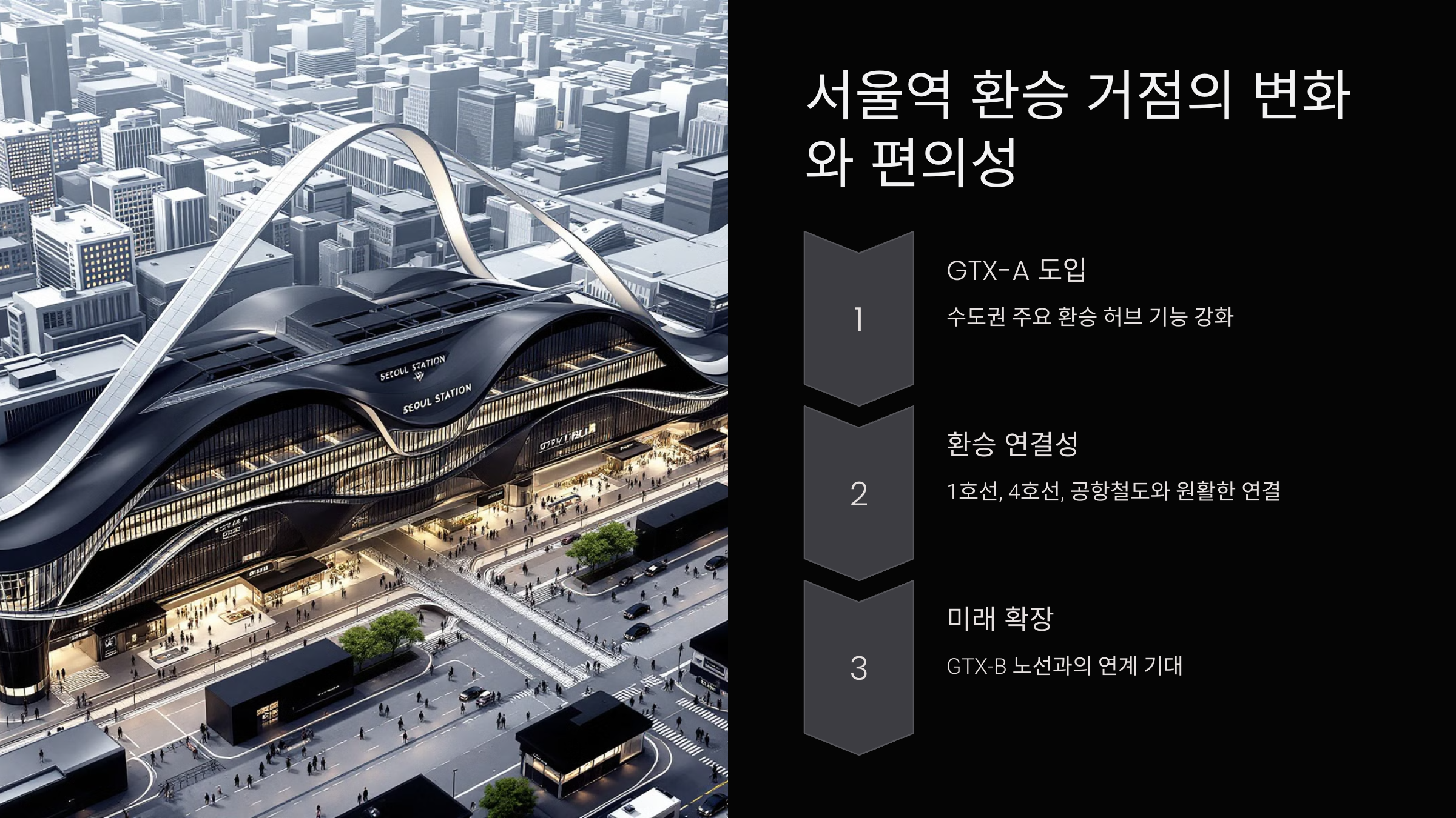 • 환승 시간 최소화: 서울역 GTX 환승 통로 설계