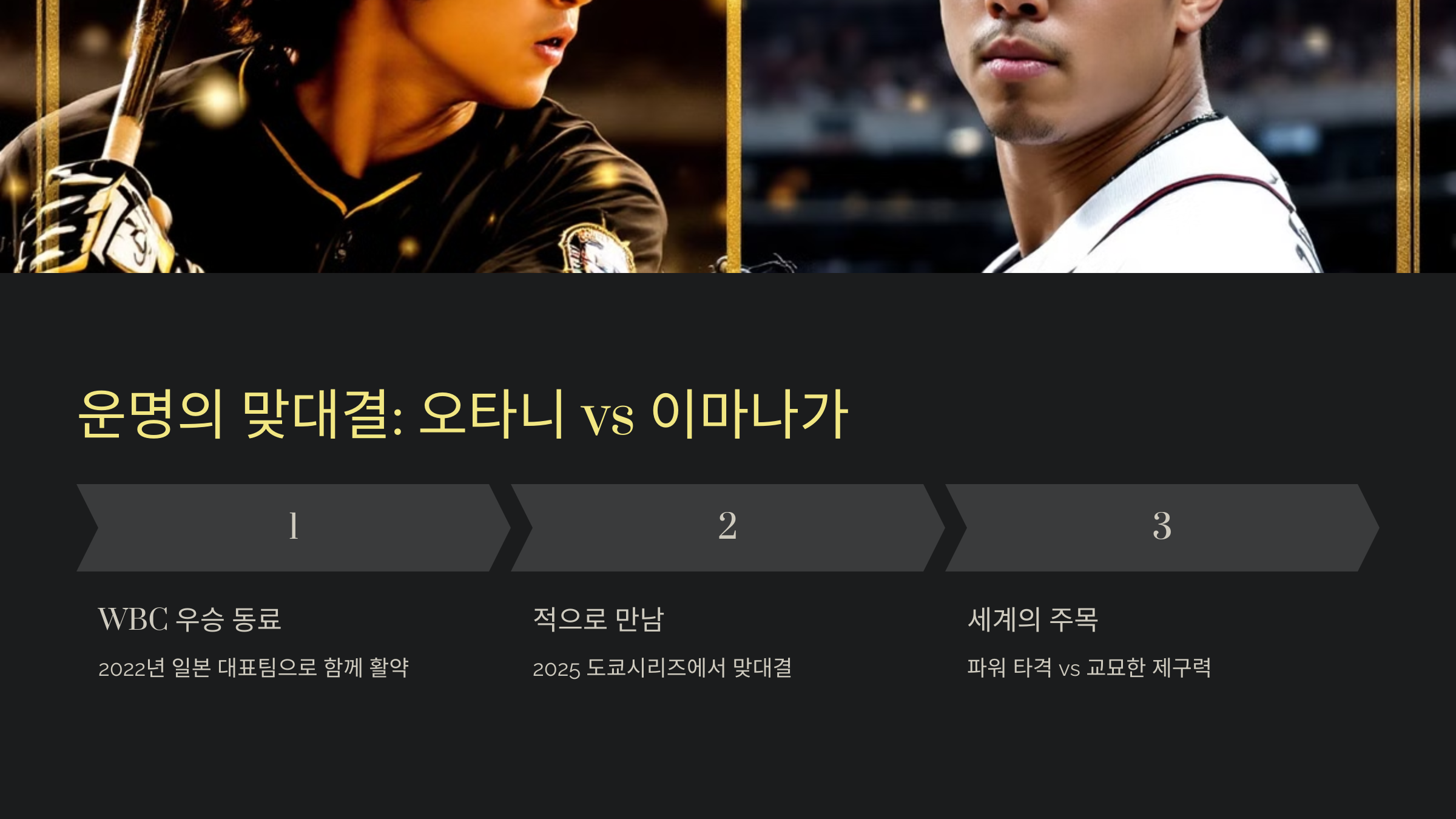 2025 도쿄시리즈에서 오타니와 이마나가의 맞대결은 그야말로 운명의 대결이 될 것입니다. 두 선수는 2022년 월드베이스볼클래식(WBC)에서 함께 일본 대표팀으로 우승을 이끌었던 동료였지만, 이제는 적으로 만나게 되었습니다.