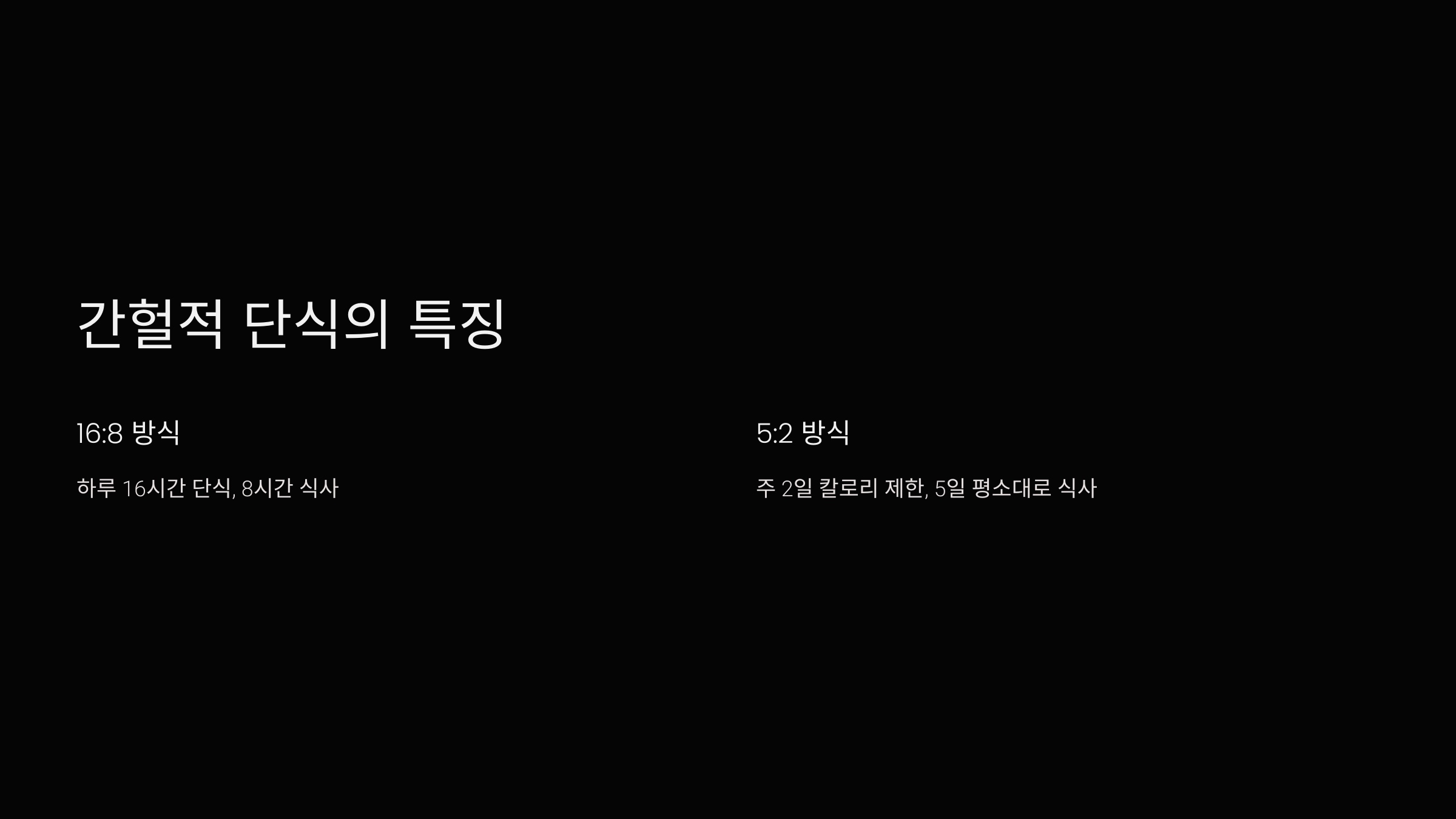 • 5:2 방식: 일주일 중 2일은 칼로리를 제한하고, 나머지 5일은 평소대로 식사.