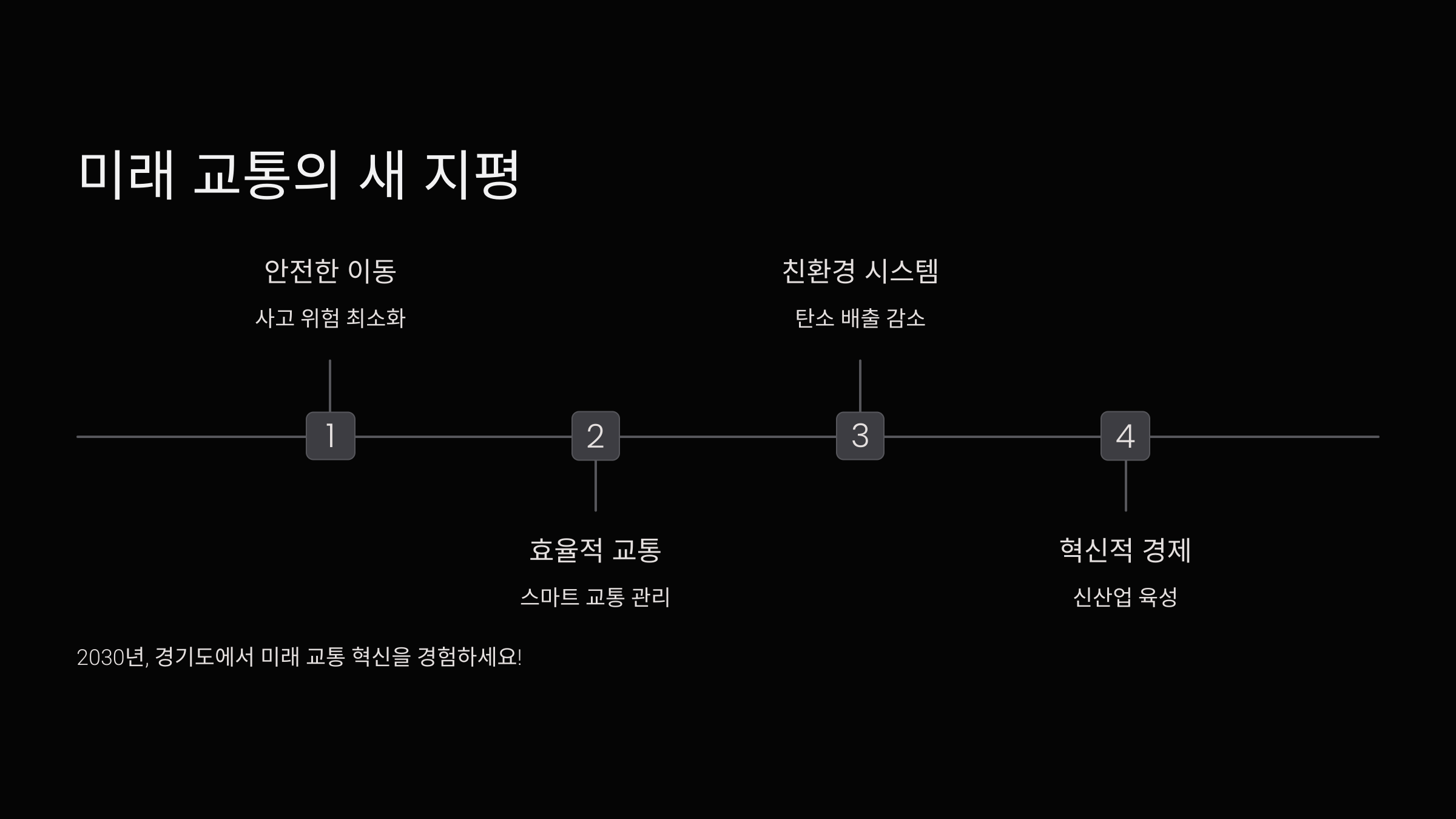 2030년, 우리는 자율주행 차량이 자유롭게 도로를 누비고, 스마트 신호가 교통 흐름을 완벽히 제어하는 모습을 경기도에서 볼 수 있을 것입니다. 미래 교통의 혁신, 경기도에서 먼저 경험해 보세요! 🚀