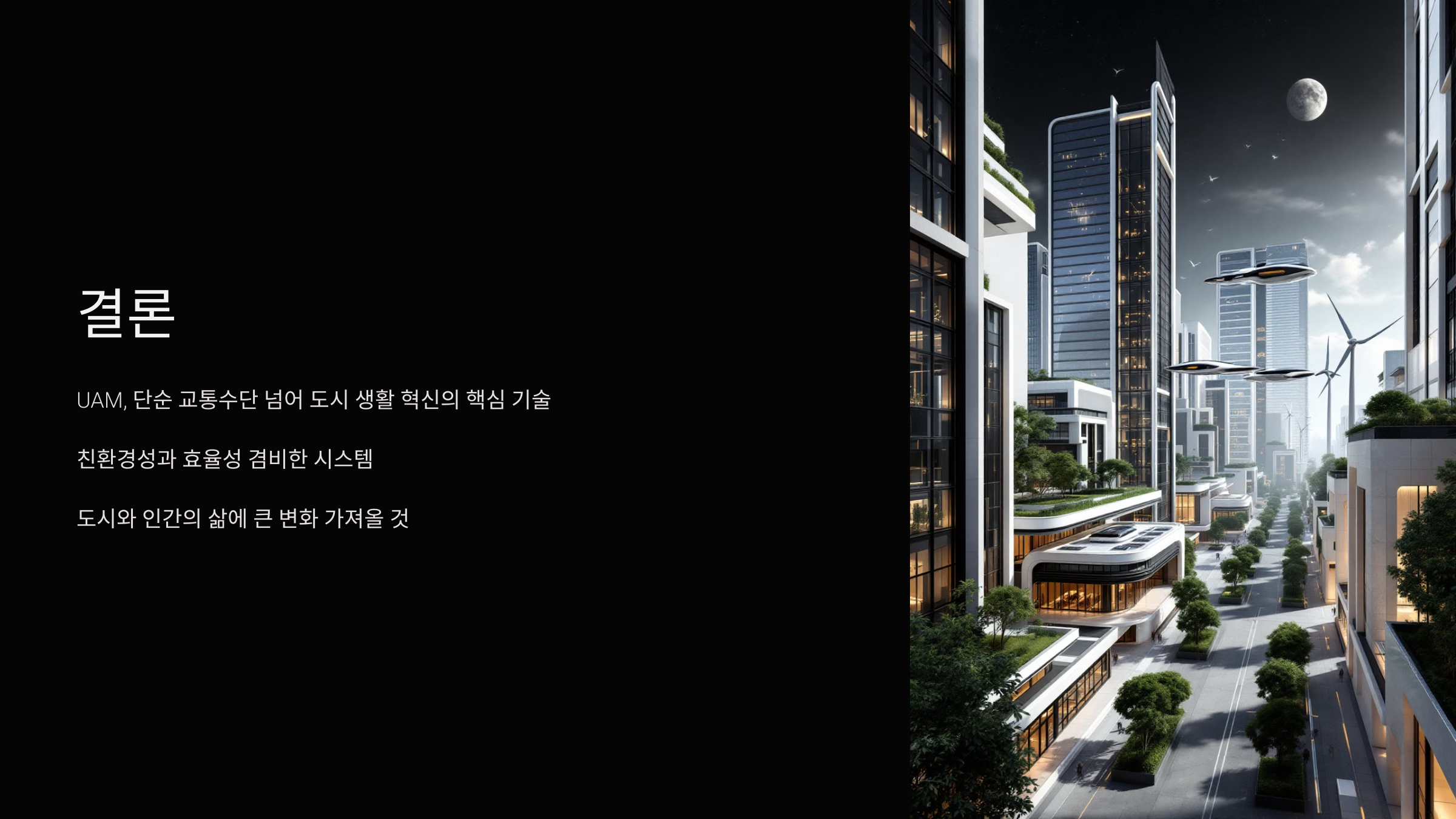 UAM은 단순한 이동 수단을 넘어 도시의 교통 패러다임 변화를 이끌며, 관련 산업 전반에 걸친 혁신을 촉진할 것으로 기대됩니다[1][4].