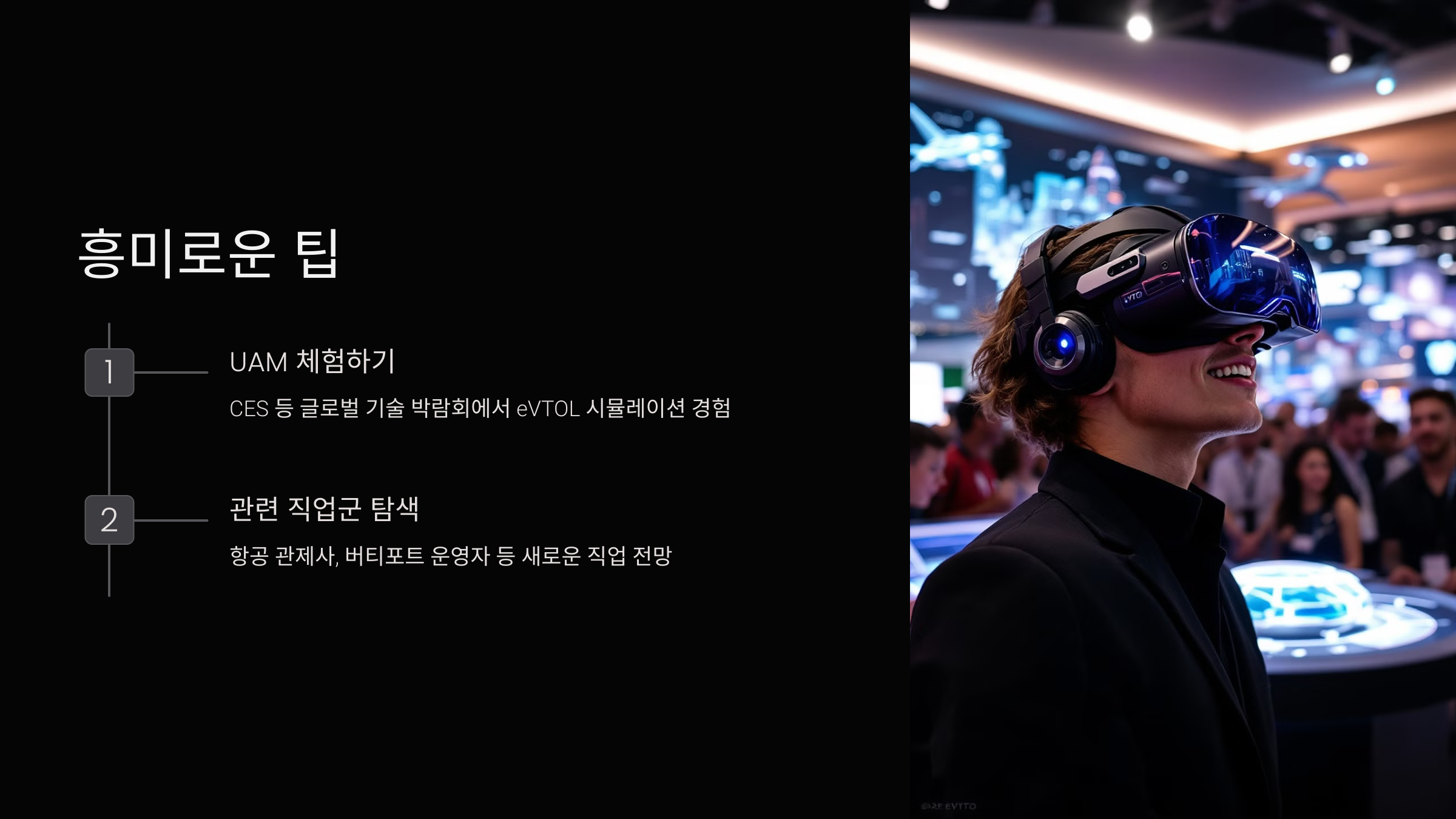 • UAM 체험하기: CES 등 글로벌 기술 박람회에서 eVTOL 시뮬레이션을 경험할 수 있습니다!