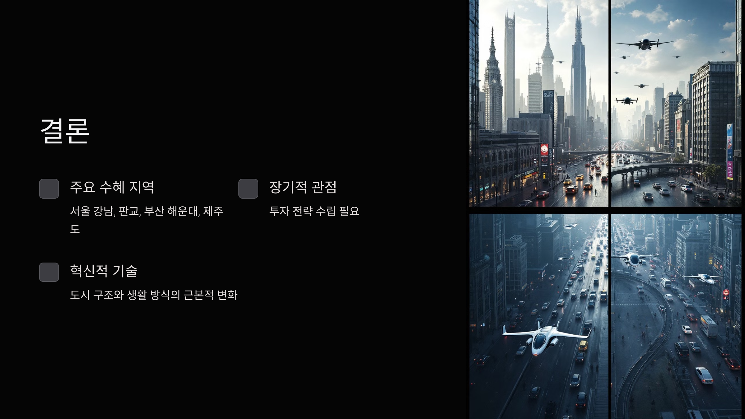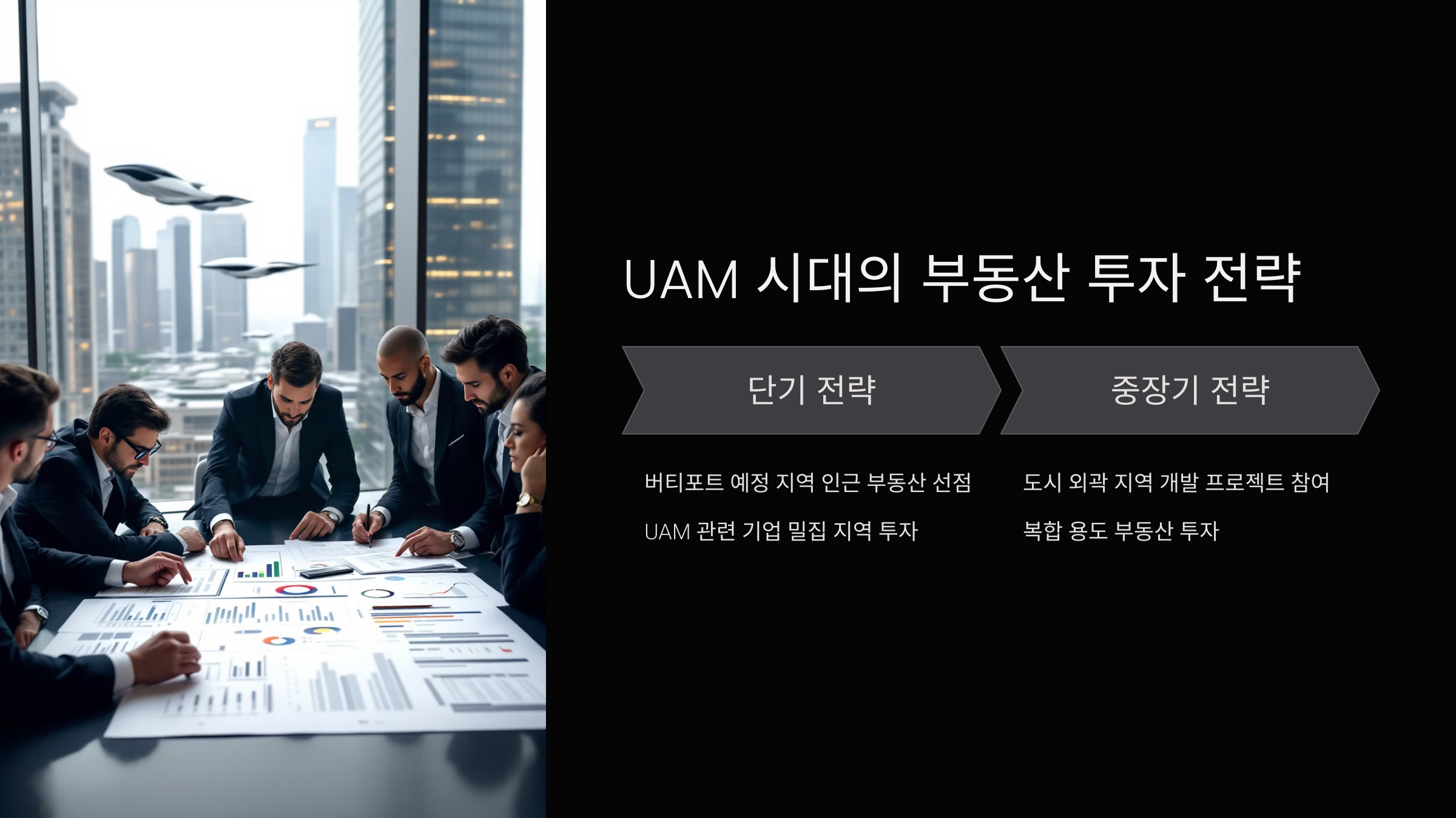 UAM의 상용화는 대한민국 부동산 시장에 큰 변화를 가져올 것입니다. 특히 서울 강남, 판교, 부산 해운대, 제주도 등의 지역이 큰 수혜를 받을 것으로 예상됩니다. 투자자들은 이러한 변화를 주시하며, 장기적인 관점에서 전략을 수립해야 할 것입니다. UAM은 단순한 교통수단의 변화가 아닌, 도시 구조와 생활 방식을 근본적으로 바꿀 수 있는 혁신적인 기술임을 명심해야 합니다.