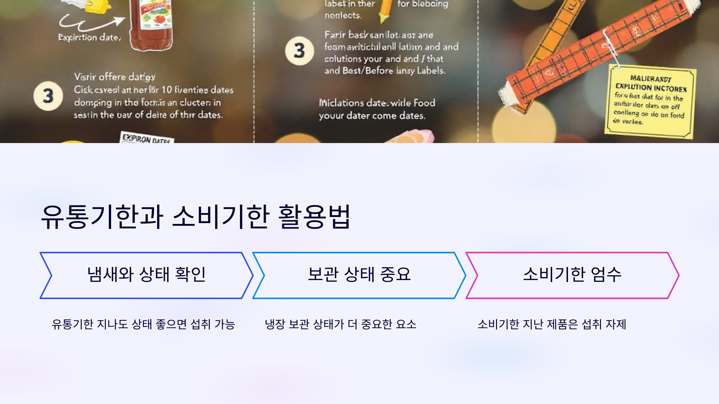 3. 보관법 준수: 제품별로 권장되는 보관 방법을 따르면 기한 내 품질을 더 오래 유지할 수 있습니다.