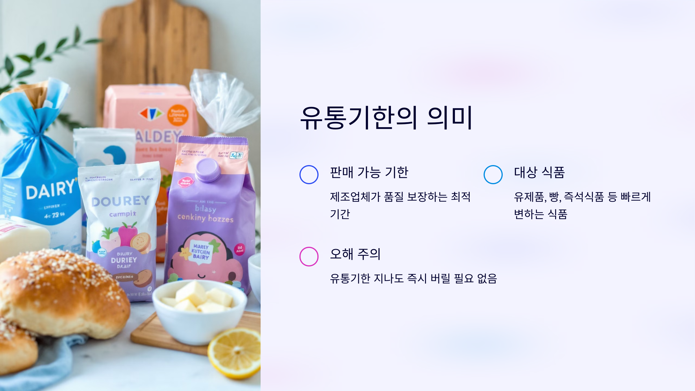 • 유통기한이 지났지만 안전한 예시: 계란(유통기한 후 12주 가능), 우유(냄새 확인 후 23일 가능).