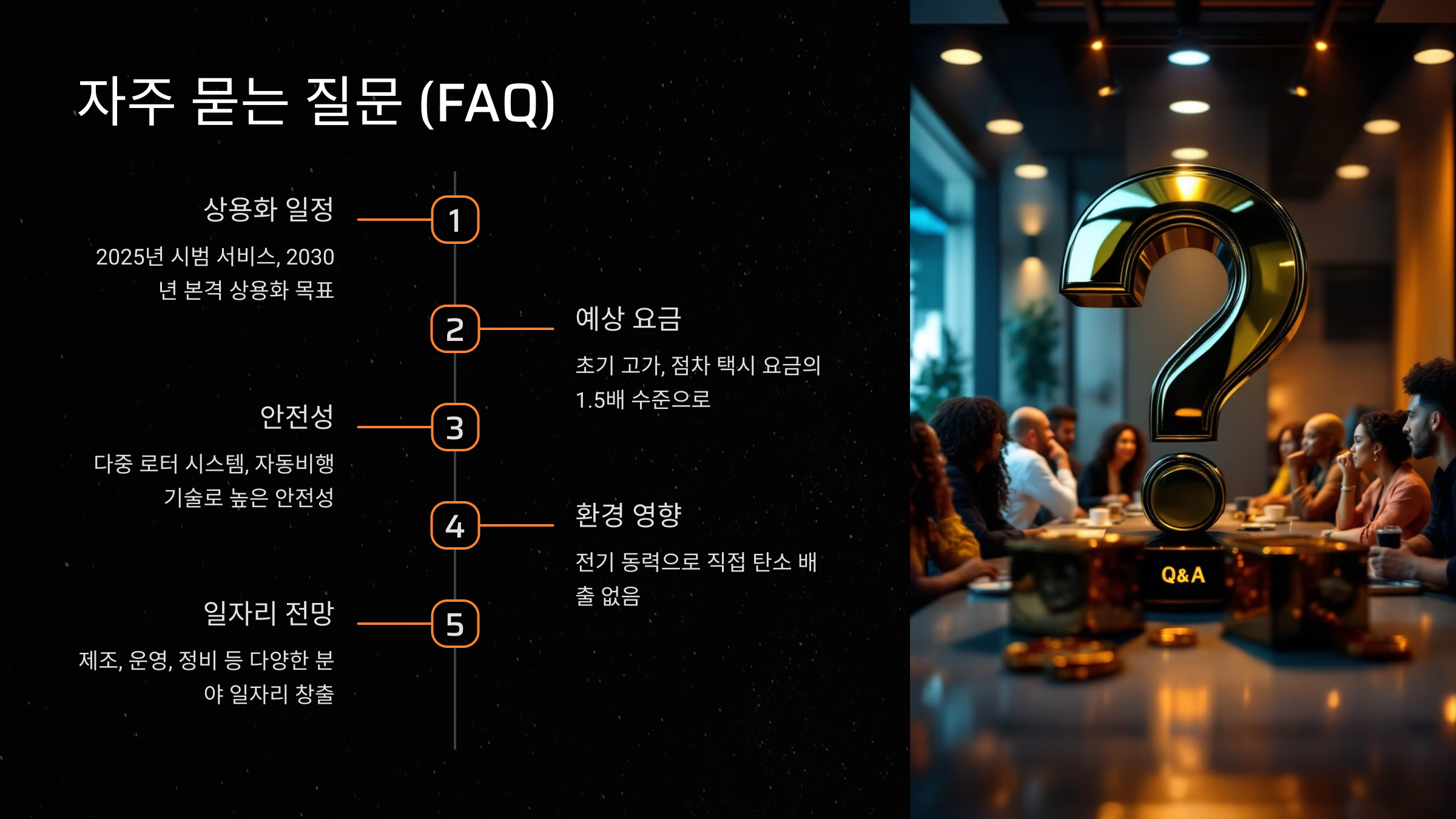 A1: 정부의 계획에 따르면, 2025년부터 시범 서비스를 시작하고 2030년 본격 상용화를 목표로 하고 있습니다.